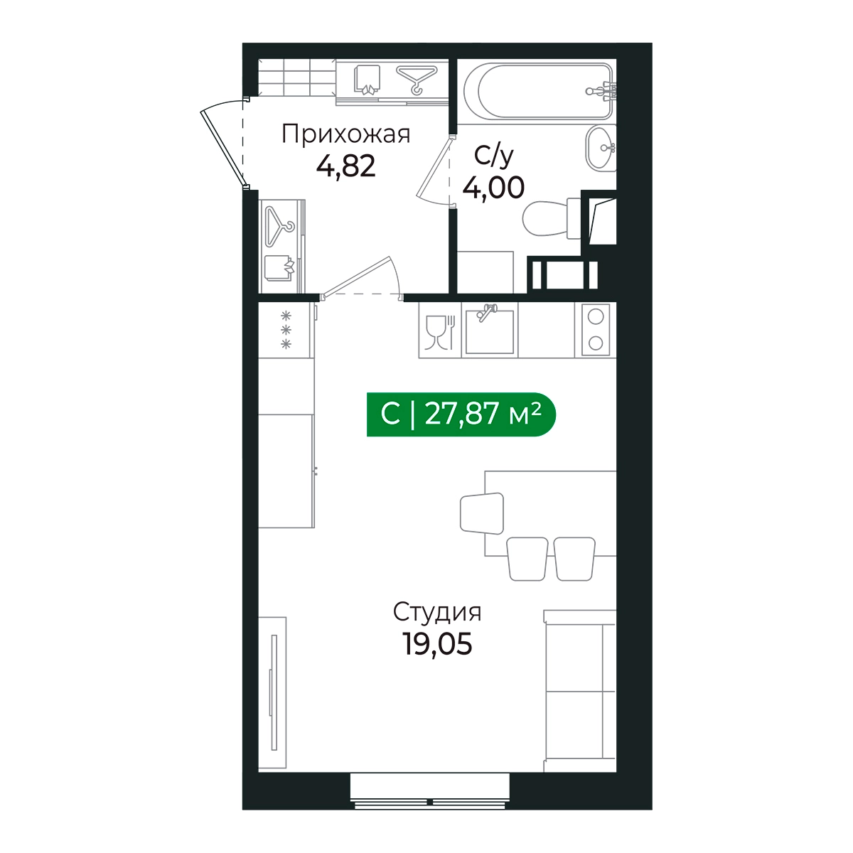 Компактная квартира, где каждый уголок зонирован и использован максимально полезно.Система хранения располагается в прихожей, а кухня и спальное место объединены в одно помещение.