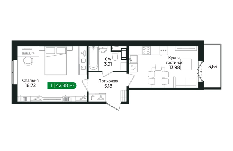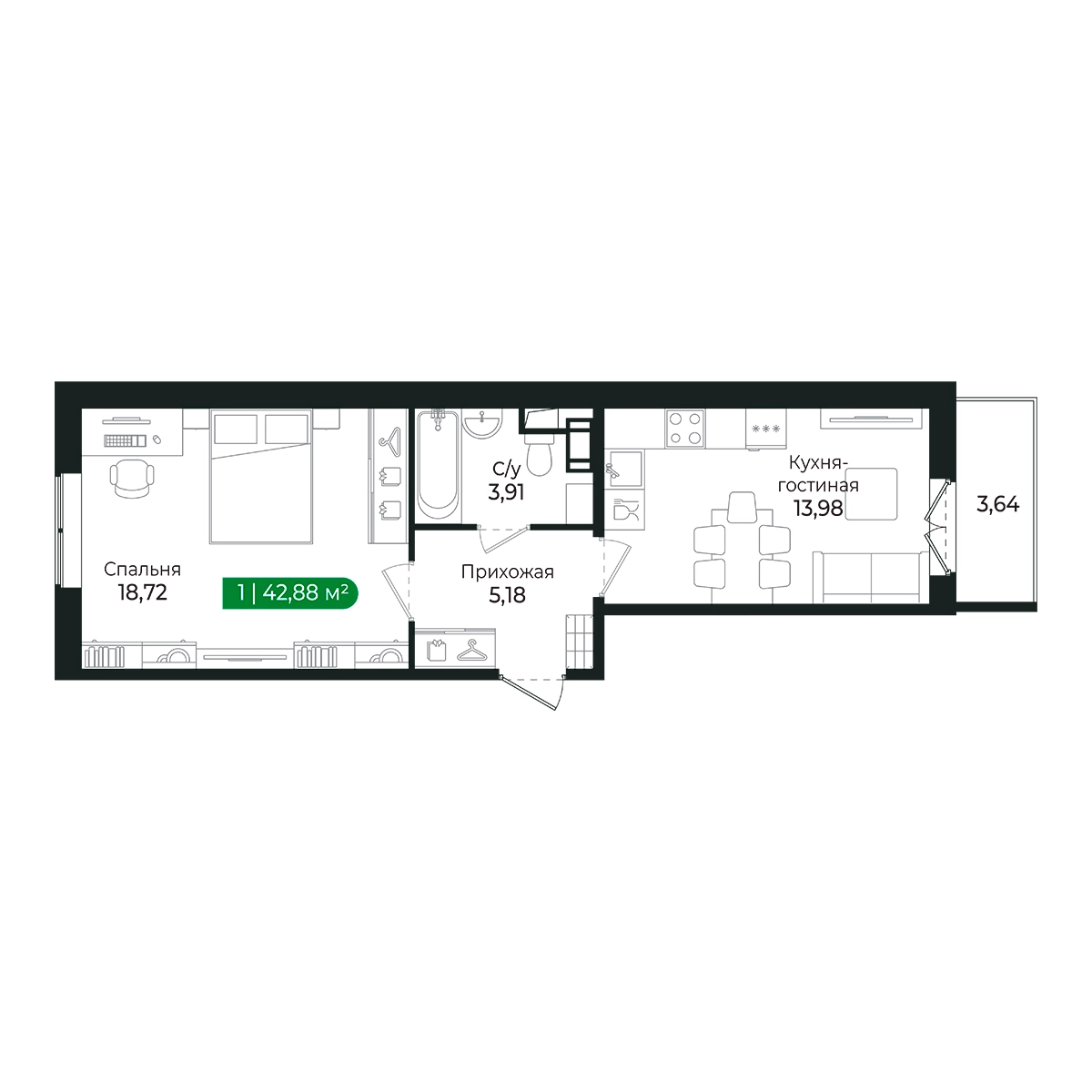 Идеальный вариант для молодой семьи.Кухня с балконом и комната (18м2) разделены прихожей и санузлом и имеют правильную геометрию.