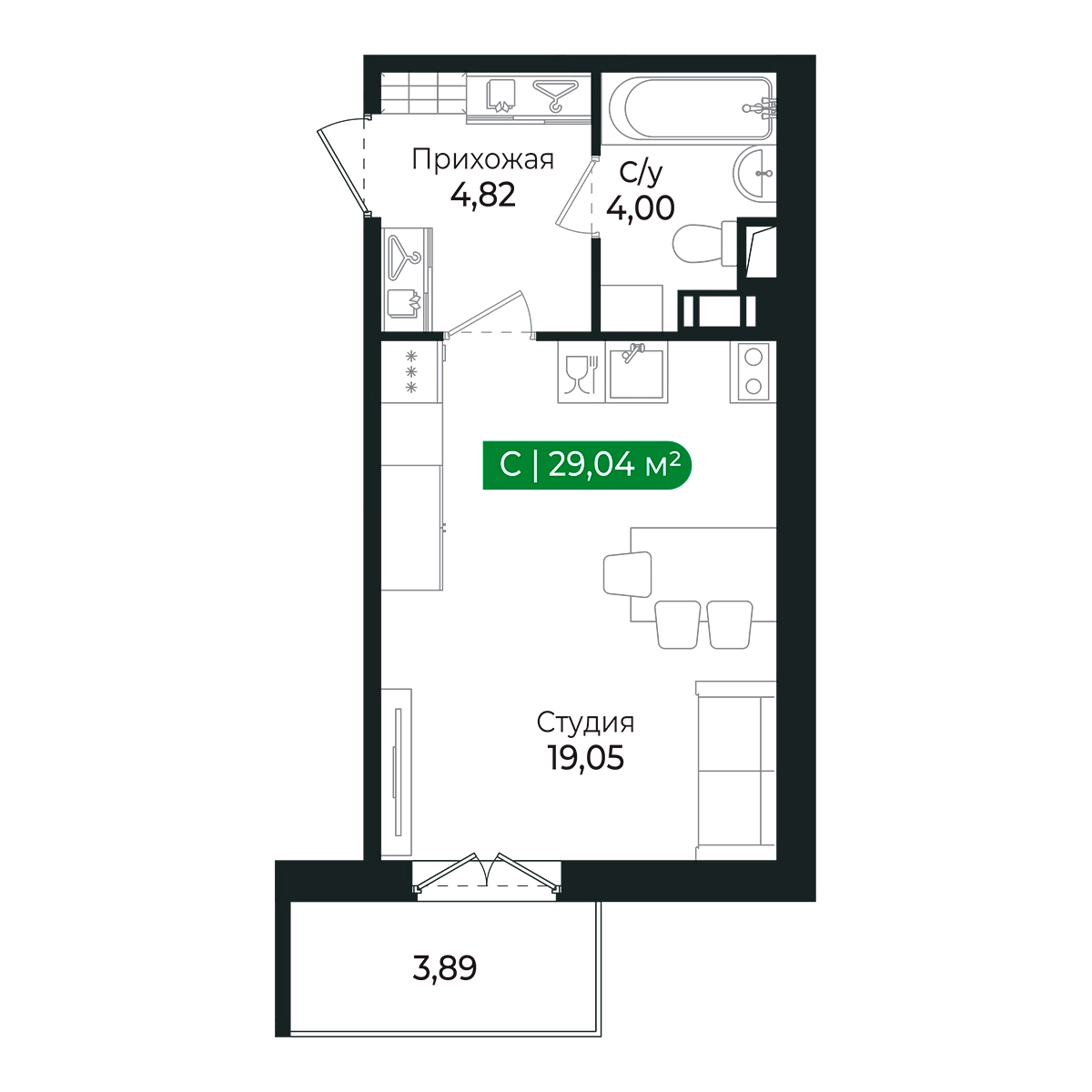Балкон (4м2) станет отличным местом для отдыха на свежем воздухе.