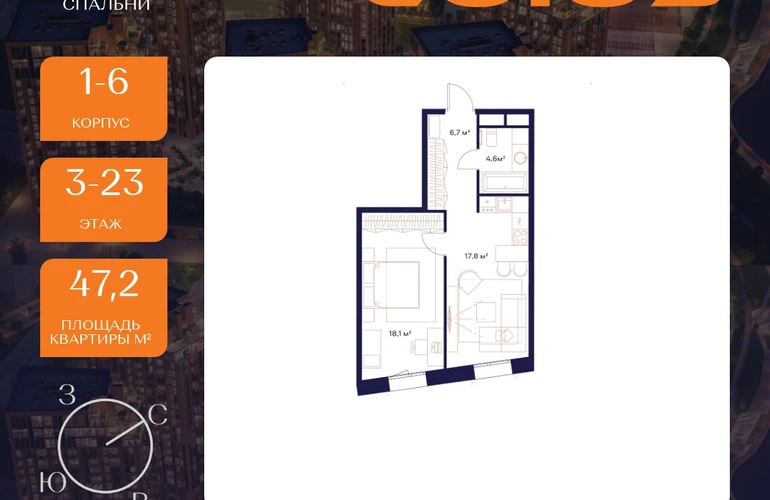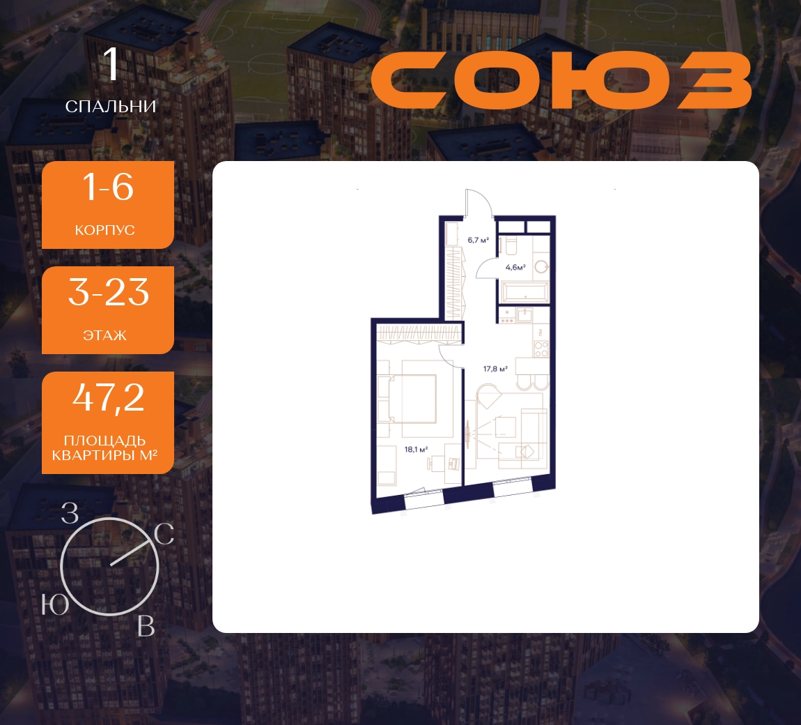 Продаётся 1-комнатная квартира площадью 47.2 м² на 3 этаже в Жилом Комплексе «Союз».
