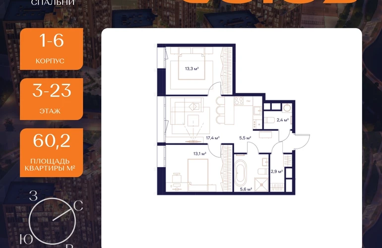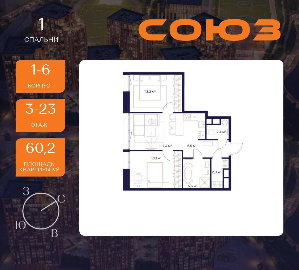 Продаётся 2-комнатная квартира площадью 60.7 м² на 3 этаже в Жилом Комплексе «Союз».
