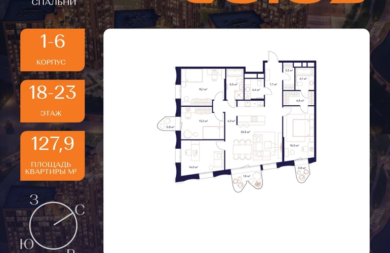 Продаётся 4-комнатная квартира площадью 127.2 м² на 18 этаже в Жилом Комплексе «Союз».