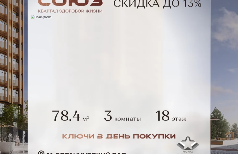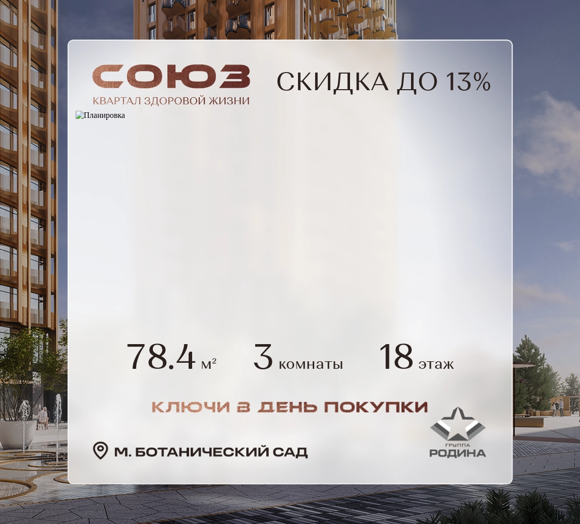 Продаётся 3-комнатная квартира площадью 78.4 м² на 18 этаже в Жилом Комплексе «Союз».