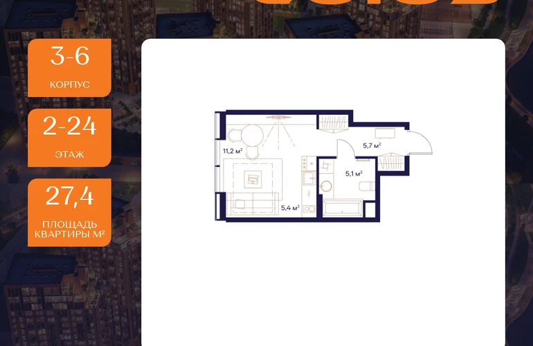 Рассрочка 0%Продаётся квартира-студия площадью 27.4 м² на 2 этаже в Жилом Комплексе «Союз».