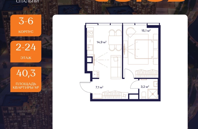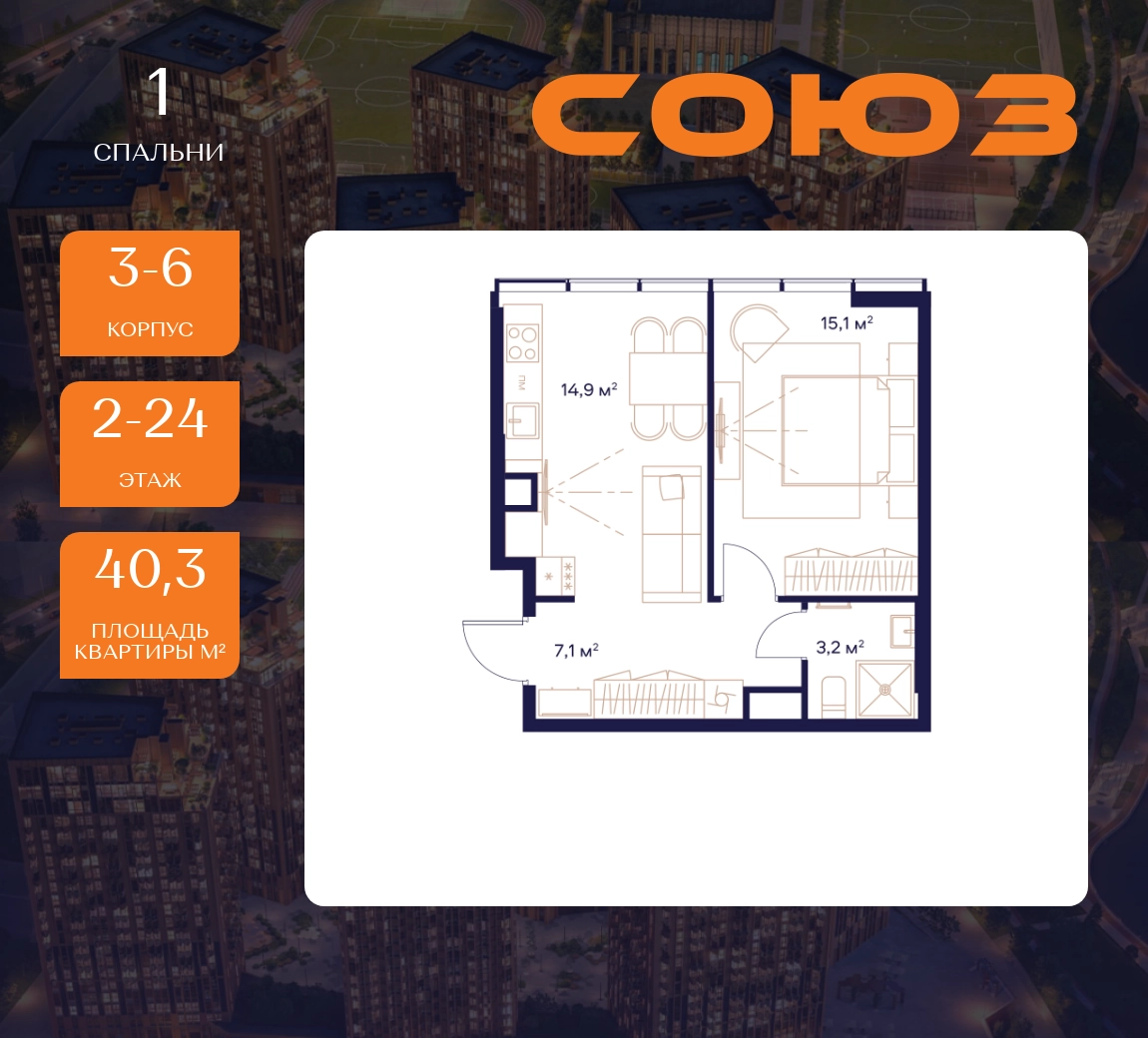 Рассрочка 0%Продаётся 1-комнатная квартира площадью 40.3 м² на 2 этаже в Жилом Комплексе «Союз».