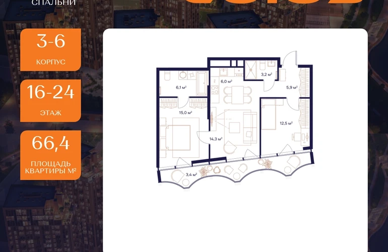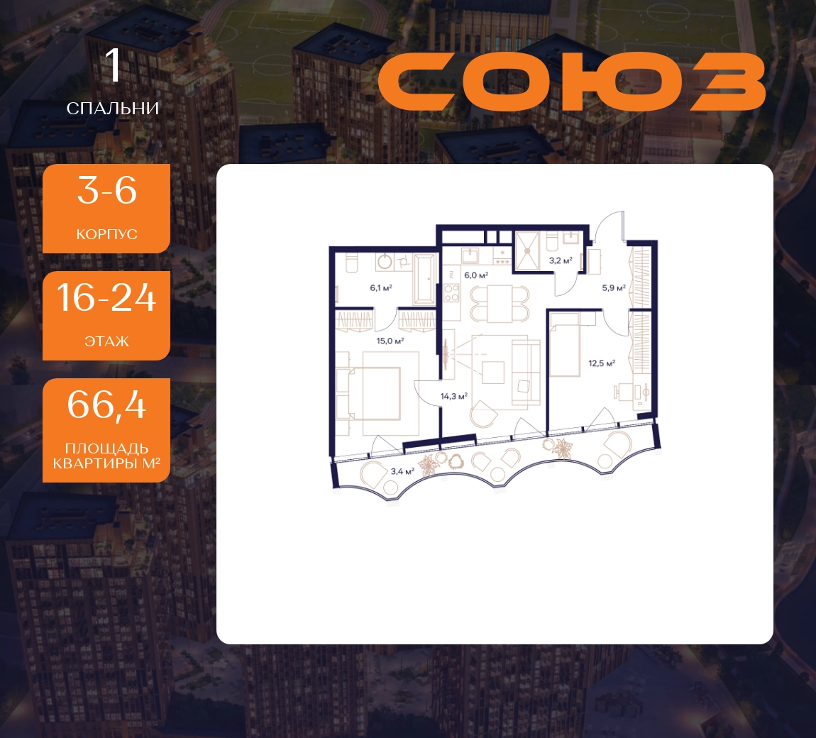 Рассрочка 0%Продаётся 2-комнатная квартира площадью 66.4 м² на 16 этаже в Жилом Комплексе «Союз».