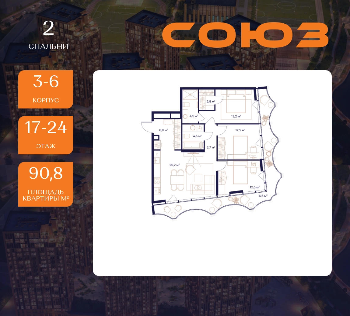 Рассрочка 0%Продаётся 3-комнатная квартира площадью 90.8 м² на 17 этаже в Жилом Комплексе «Союз».