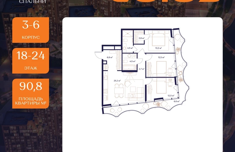 Рассрочка 0%Продаётся 3-комнатная квартира площадью 90.8 м² на 18 этаже в Жилом Комплексе «Союз».