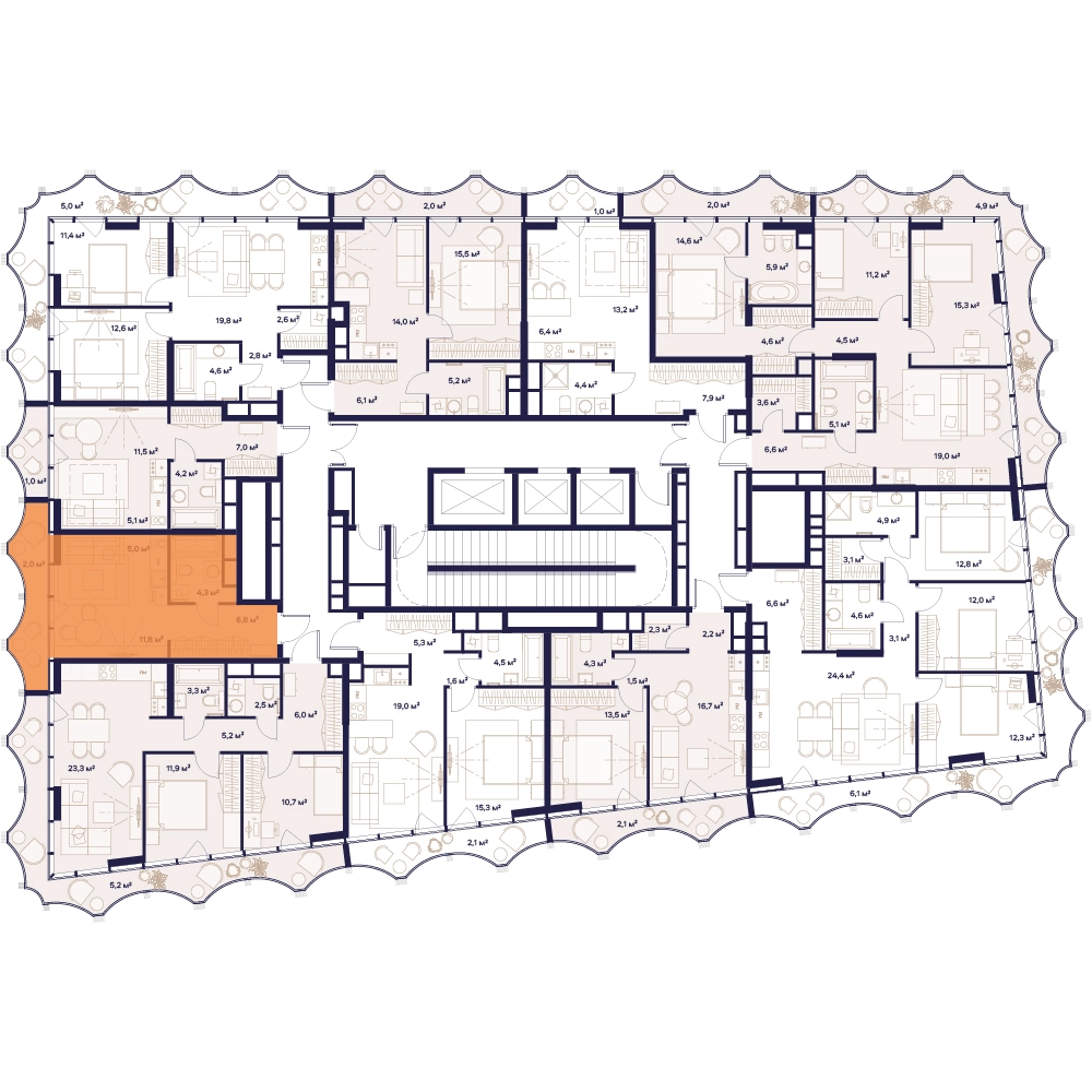 Уникальные форматы квартир с мастер-спальнями, приватными террасами, балконами, а также пентхаусы с открыточными видами на город.
