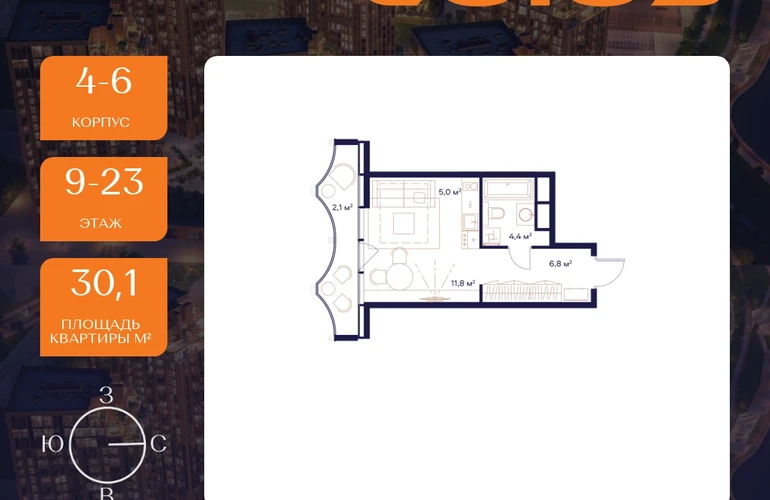 Рассрочка 0%Продаётся квартира-студия площадью 30.1 м² на 9 этаже в Жилом Комплексе «Союз».