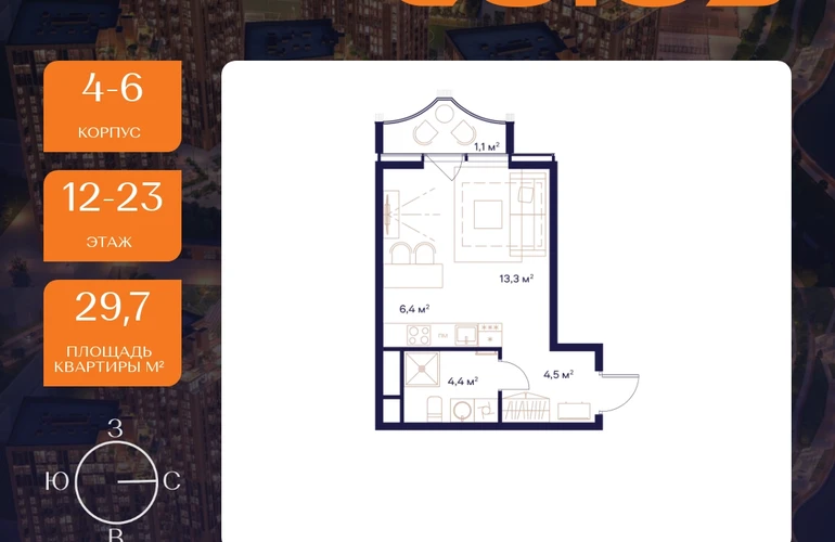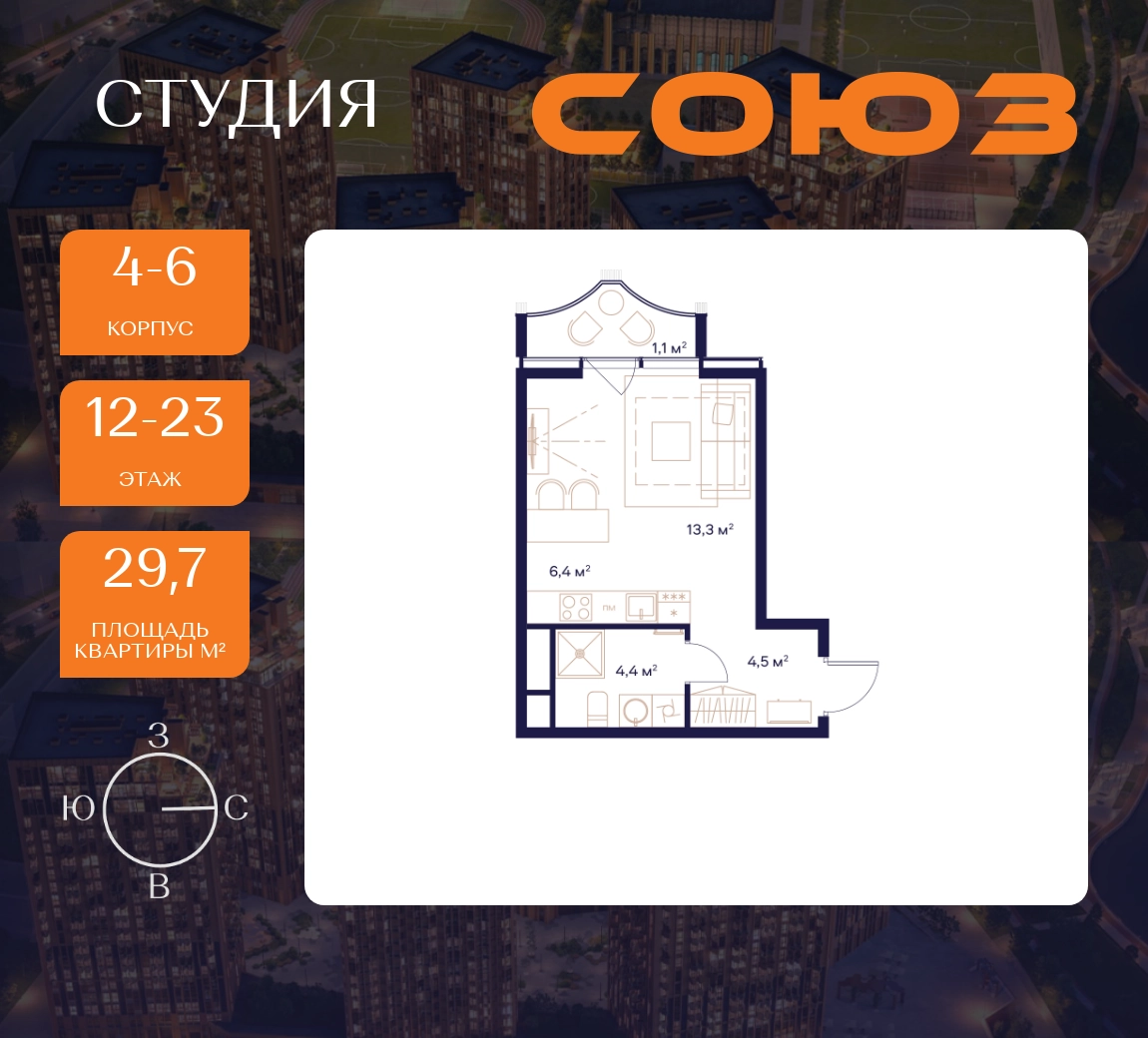 Рассрочка 0%Продаётся квартира-студия площадью 29.7 м² на 12 этаже в Жилом Комплексе «Союз».