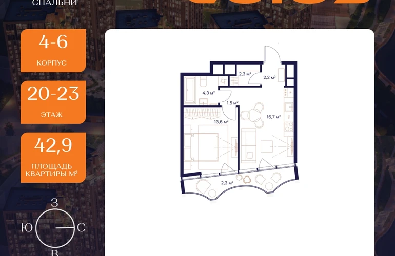 Рассрочка 0%Продаётся 1-комнатная квартира площадью 42.9 м² на 20 этаже в Жилом Комплексе «Союз».
