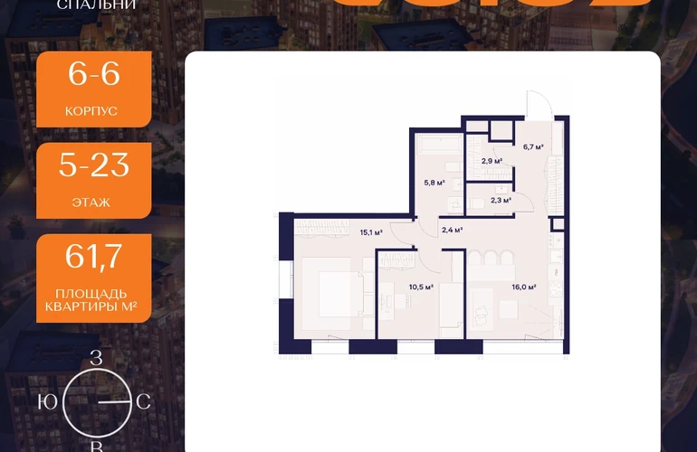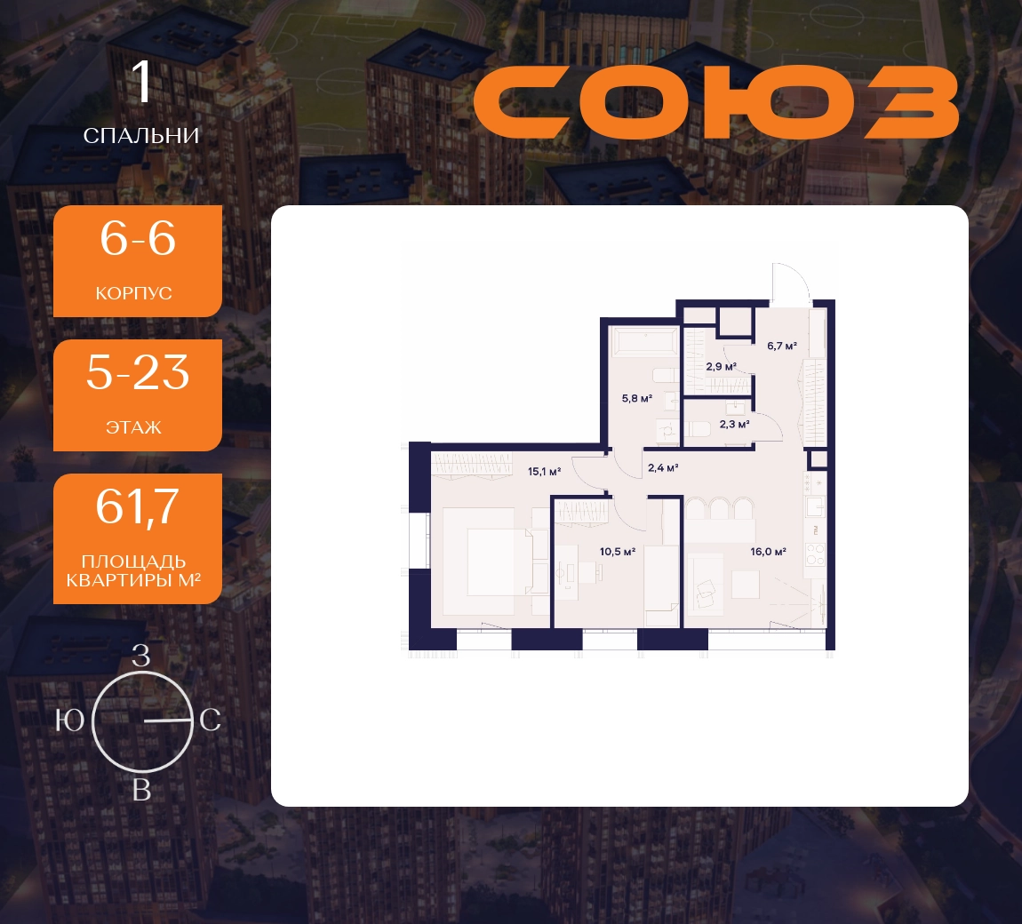 Рассрочка 0%Продаётся 2-комнатная квартира площадью 61.7 м² на 5 этаже в Жилом Комплексе «Союз».