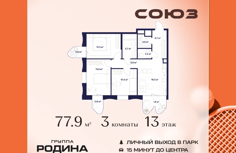 Рассрочка 0%Продаётся 3-комнатная квартира площадью 77.9 м² на 13 этаже в Жилом Комплексе «Союз».