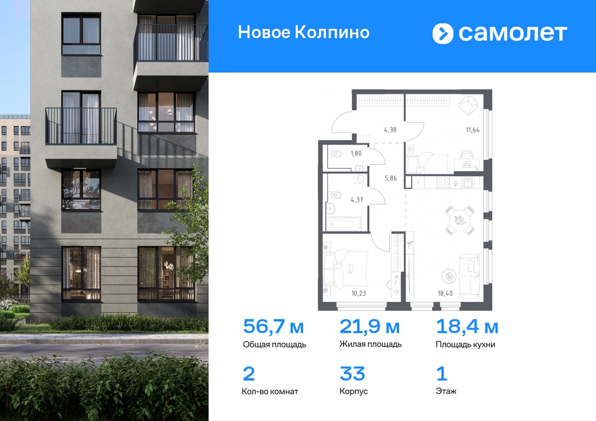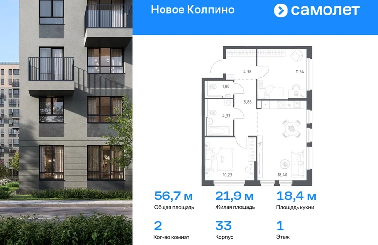 Строим кварталы для жизни с заботой о будущем. Предлагается 2-комнатная квартира комфорт-класса 56,68 кв.м в корпусе 33 на 1 этаже, в ЖК «Новое Колпино» Квартира с предчистовой отделкой. Доступность дополнительных опций уточняйте у застройщика. Приобрести квартиру возможно по специальным акциям от застройщика, с текущими условиями акций можно ознакомиться в блоке «Акций». Цена динамическая и может отличаться, уточняйте актуальность у застройщика. Квартал «Новое Колпино» — современный квартал в тихом и зеленом районе Санкт-Петербурга. Здесь можно подолгу любоваться пышными кронами деревьев, подставляя лицо теплым лучам солнца. А еще в любой момент можно сесть в машину и уже через час оказаться в сердце Северной столицы. Будет легко планировать поездки: до центра Петербурга, или площади Восстания, — 25 минут на поезде. С территории квартала удобно выезжать на крупные магистрали: путь до Южного шоссе займет 15 минут на авто, а до Петрозаводского шоссе — всего 6 минут. В 20 минутах на авто находится метро «Рыбацкое», а в 7 минутах — ж/д станция Колпино. Проводите выходные на природе в Колпинском парке, который находится недалеко от квартала, на берегу реки Ижоры. Летом здесь можно вместе с детьми веселиться на аттракционах, кататься на лодке, играть в бадминтон или волейбол. А еще можно захватить орехов и покормить белок. Всего 7 минут на авто или автобусе — и вы в центре города Колпино. Взрослых впечатлит русская архитектура старинных церквей, а детям понравится забавный памятник героям мультфильма «Трое из Простоквашино». В «Новом Колпино» будут работать 4 детских сада, 3 из них уже готовы встречать малышей. Ребята постарше могут ходить на занятия в школу с собственным бассейном, в проекте уже работает новая современная школа с бассейном Корпуса высотой 11 этажей с французскими и панорамными балконами отделаны штукатуркой и облицовочным кирпичом. Вдохновение для палитры нам подарили оттенки рассветного неба: терракотовый, персиковый, песочный. Во дворе найдется интересное занятие для всех жителей квартала. Взрослые смогут устраивать тренировки на свежем воздухе в спортивных зонах, дети будут целый день веселиться на игровых площадках. А еще мы позаботились о вашей безопасности и закрыли дворы от машин. Возвращайтесь домой с чемоданом из путешествия или коляской из парка. На пути в подъезд вы не встретите ступенек. Оставить транспорт можно будет в специальном помещении на первом этаже. По желанию вы сможете получить ключи от квартиры с готовой отделкой. Мы положим ламинат, поклеим обои, установим мебель и сантехнику. Доступен вариант с готовой кухней — бежевые тона отделки станут фоном для интерьера мечты. Чтобы сразу отпраздновать новоселье, закажите у нас декор и мебельные сеты. А если хочется воплотить собственные идеи в интерьере, присмотритесь к опции — без отделки.#yan19-2r1589000#О застройщике