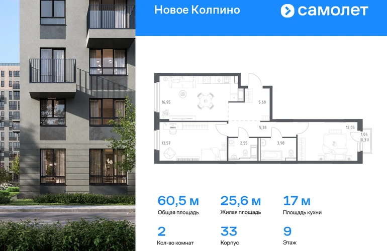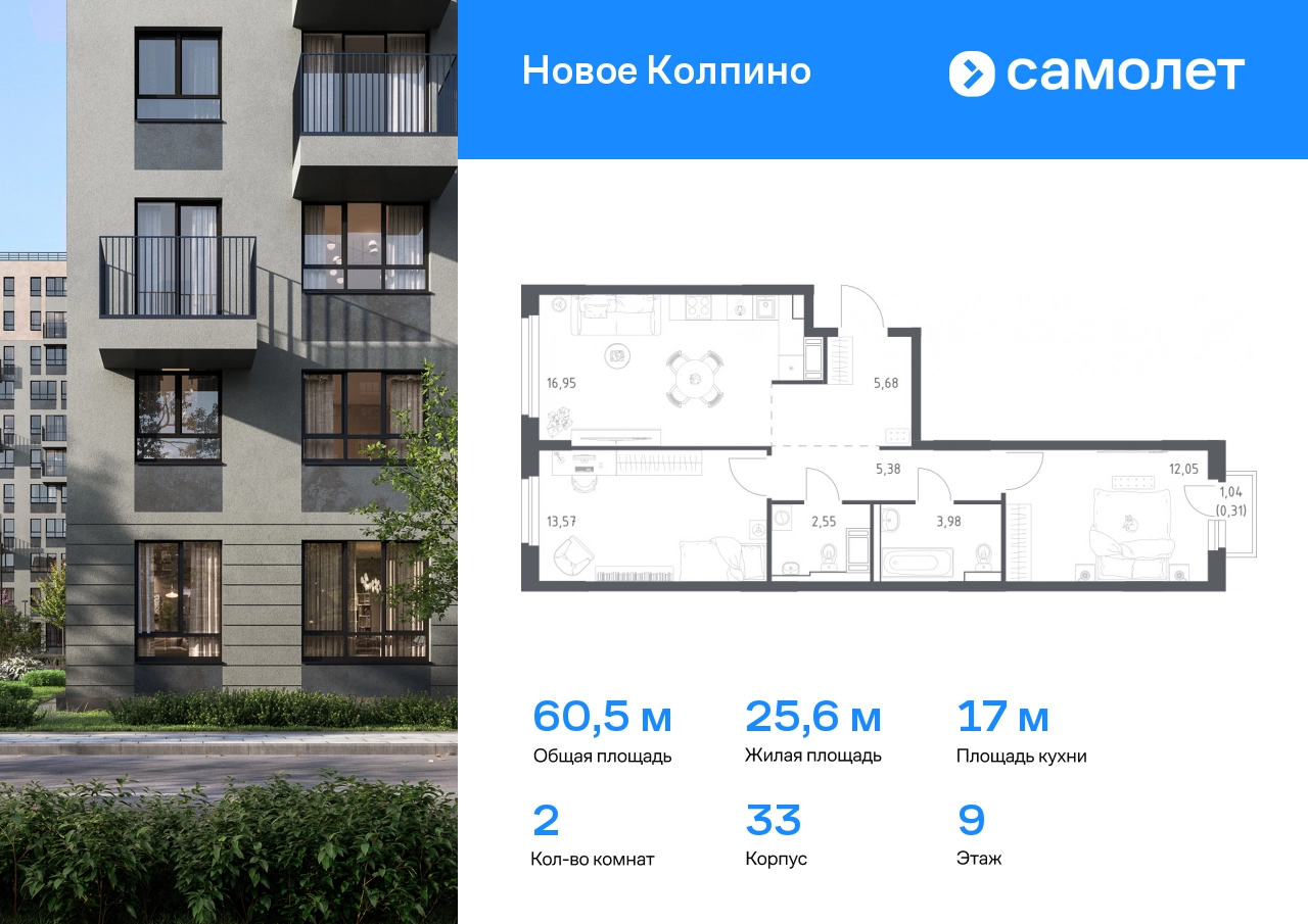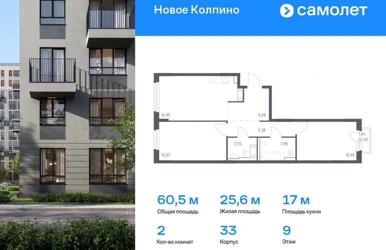 Строим кварталы для жизни с заботой о будущем. Предлагается 2-комнатная квартира комфорт-класса 60,47 кв.м в корпусе 33 на 9 этаже, в ЖК «Новое Колпино» Квартира без отделки. Доступность опции «отделка» и возможность комплектации мебелью и декором уточняйте у застройщика. Приобрести квартиру возможно по специальным акциям от застройщика, с текущими условиями акций можно ознакомиться в блоке «Акций». Цена динамическая и может отличаться, уточняйте актуальность у застройщика. Квартал «Новое Колпино» — современный квартал в тихом и зеленом районе Санкт-Петербурга. Здесь можно подолгу любоваться пышными кронами деревьев, подставляя лицо теплым лучам солнца. А еще в любой момент можно сесть в машину и уже через час оказаться в сердце Северной столицы. Будет легко планировать поездки: до центра Петербурга, или площади Восстания, — 25 минут на поезде. С территории квартала удобно выезжать на крупные магистрали: путь до Южного шоссе займет 15 минут на авто, а до Петрозаводского шоссе — всего 6 минут. В 20 минутах на авто находится метро «Рыбацкое», а в 7 минутах — ж/д станция Колпино. Проводите выходные на природе в Колпинском парке, который находится недалеко от квартала, на берегу реки Ижоры. Летом здесь можно вместе с детьми веселиться на аттракционах, кататься на лодке, играть в бадминтон или волейбол. А еще можно захватить орехов и покормить белок. Всего 7 минут на авто или автобусе — и вы в центре города Колпино. Взрослых впечатлит русская архитектура старинных церквей, а детям понравится забавный памятник героям мультфильма «Трое из Простоквашино». В «Новом Колпино» будут работать 4 детских сада, 3 из них уже готовы встречать малышей. Ребята постарше могут ходить на занятия в школу с собственным бассейном, в проекте уже работает новая современная школа с бассейном Корпуса высотой 11 этажей с французскими и панорамными балконами отделаны штукатуркой и облицовочным кирпичом. Вдохновение для палитры нам подарили оттенки рассветного неба: терракотовый, персиковый, песочный. Во дворе найдется интересное занятие для всех жителей квартала. Взрослые смогут устраивать тренировки на свежем воздухе в спортивных зонах, дети будут целый день веселиться на игровых площадках. А еще мы позаботились о вашей безопасности и закрыли дворы от машин. Возвращайтесь домой с чемоданом из путешествия или коляской из парка. На пути в подъезд вы не встретите ступенек. Оставить транспорт можно будет в специальном помещении на первом этаже. По желанию вы сможете получить ключи от квартиры с готовой отделкой. Мы положим ламинат, поклеим обои, установим мебель и сантехнику. Доступен вариант с готовой кухней — бежевые тона отделки станут фоном для интерьера мечты. Чтобы сразу отпраздновать новоселье, закажите у нас декор и мебельные сеты. А если хочется воплотить собственные идеи в интерьере, присмотритесь к опции — без отделки.#yan19-2r1607595#О застройщике