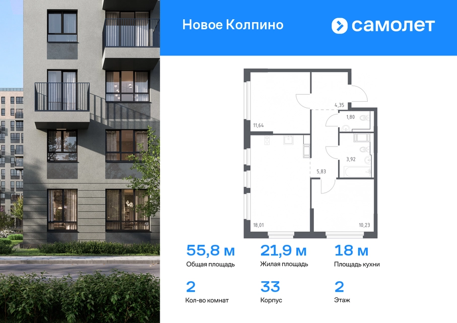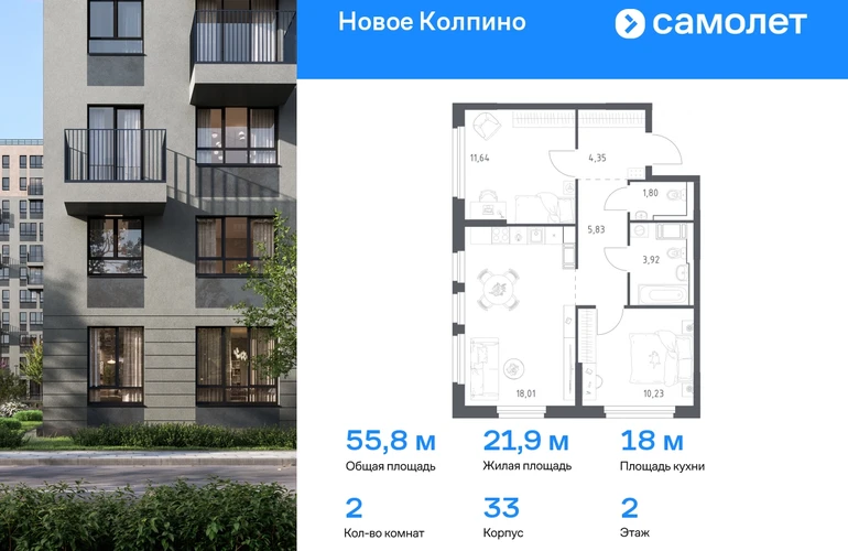 Строим кварталы для жизни с заботой о будущем. Предлагается 2-комнатная квартира комфорт-класса 55,78 кв.м в корпусе 33 на 2 этаже, в ЖК «Новое Колпино» Квартира с предчистовой отделкой. Доступность дополнительных опций уточняйте у застройщика. Приобрести квартиру возможно по специальным акциям от застройщика, с текущими условиями акций можно ознакомиться в блоке «Акций». Цена динамическая и может отличаться, уточняйте актуальность у застройщика. Квартал «Новое Колпино» — современный квартал в тихом и зеленом районе Санкт-Петербурга. Здесь можно подолгу любоваться пышными кронами деревьев, подставляя лицо теплым лучам солнца. А еще в любой момент можно сесть в машину и уже через час оказаться в сердце Северной столицы. Будет легко планировать поездки: до центра Петербурга, или площади Восстания, — 25 минут на поезде. С территории квартала удобно выезжать на крупные магистрали: путь до Южного шоссе займет 15 минут на авто, а до Петрозаводского шоссе — всего 6 минут. В 20 минутах на авто находится метро «Рыбацкое», а в 7 минутах — ж/д станция Колпино. Проводите выходные на природе в Колпинском парке, который находится недалеко от квартала, на берегу реки Ижоры. Летом здесь можно вместе с детьми веселиться на аттракционах, кататься на лодке, играть в бадминтон или волейбол. А еще можно захватить орехов и покормить белок. Всего 7 минут на авто или автобусе — и вы в центре города Колпино. Взрослых впечатлит русская архитектура старинных церквей, а детям понравится забавный памятник героям мультфильма «Трое из Простоквашино». В «Новом Колпино» будут работать 4 детских сада, 3 из них уже готовы встречать малышей. Ребята постарше могут ходить на занятия в школу с собственным бассейном, в проекте уже работает новая современная школа с бассейном Корпуса высотой 11 этажей с французскими и панорамными балконами отделаны штукатуркой и облицовочным кирпичом. Вдохновение для палитры нам подарили оттенки рассветного неба: терракотовый, персиковый, песочный. Во дворе найдется интересное занятие для всех жителей квартала. Взрослые смогут устраивать тренировки на свежем воздухе в спортивных зонах, дети будут целый день веселиться на игровых площадках. А еще мы позаботились о вашей безопасности и закрыли дворы от машин. Возвращайтесь домой с чемоданом из путешествия или коляской из парка. На пути в подъезд вы не встретите ступенек. Оставить транспорт можно будет в специальном помещении на первом этаже. По желанию вы сможете получить ключи от квартиры с готовой отделкой. Мы положим ламинат, поклеим обои, установим мебель и сантехнику. Доступен вариант с готовой кухней — бежевые тона отделки станут фоном для интерьера мечты. Чтобы сразу отпраздновать новоселье, закажите у нас декор и мебельные сеты. А если хочется воплотить собственные идеи в интерьере, присмотритесь к опции — без отделки.#yan19-2r1621532#О застройщике