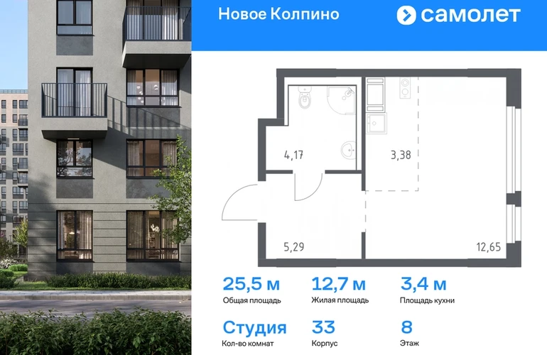 Строим кварталы для жизни с заботой о будущем. Предлагается квартира студия комфорт-класса 25,49 кв.м в корпусе 33 на 8 этаже, в ЖК «Новое Колпино» Квартира без отделки. Доступность опции «отделка» и возможность комплектации мебелью и декором уточняйте у застройщика. Приобрести квартиру возможно по специальным акциям от застройщика, с текущими условиями акций можно ознакомиться в блоке «Акций». Цена динамическая и может отличаться, уточняйте актуальность у застройщика. Квартал «Новое Колпино» — современный квартал в тихом и зеленом районе Санкт-Петербурга. Здесь можно подолгу любоваться пышными кронами деревьев, подставляя лицо теплым лучам солнца. А еще в любой момент можно сесть в машину и уже через час оказаться в сердце Северной столицы. Будет легко планировать поездки: до центра Петербурга, или площади Восстания, — 25 минут на поезде. С территории квартала удобно выезжать на крупные магистрали: путь до Южного шоссе займет 15 минут на авто, а до Петрозаводского шоссе — всего 6 минут. В 20 минутах на авто находится метро «Рыбацкое», а в 7 минутах — ж/д станция Колпино. Проводите выходные на природе в Колпинском парке, который находится недалеко от квартала, на берегу реки Ижоры. Летом здесь можно вместе с детьми веселиться на аттракционах, кататься на лодке, играть в бадминтон или волейбол. А еще можно захватить орехов и покормить белок. Всего 7 минут на авто или автобусе — и вы в центре города Колпино. Взрослых впечатлит русская архитектура старинных церквей, а детям понравится забавный памятник героям мультфильма «Трое из Простоквашино». В «Новом Колпино» будут работать 4 детских сада, 3 из них уже готовы встречать малышей. Ребята постарше могут ходить на занятия в школу с собственным бассейном, в проекте уже работает новая современная школа с бассейном Корпуса высотой 11 этажей с французскими и панорамными балконами отделаны штукатуркой и облицовочным кирпичом. Вдохновение для палитры нам подарили оттенки рассветного неба: терракотовый, персиковый, песочный. Во дворе найдется интересное занятие для всех жителей квартала. Взрослые смогут устраивать тренировки на свежем воздухе в спортивных зонах, дети будут целый день веселиться на игровых площадках. А еще мы позаботились о вашей безопасности и закрыли дворы от машин. Возвращайтесь домой с чемоданом из путешествия или коляской из парка. На пути в подъезд вы не встретите ступенек. Оставить транспорт можно будет в специальном помещении на первом этаже. По желанию вы сможете получить ключи от квартиры с готовой отделкой. Мы положим ламинат, поклеим обои, установим мебель и сантехнику. Доступен вариант с готовой кухней — бежевые тона отделки станут фоном для интерьера мечты. Чтобы сразу отпраздновать новоселье, закажите у нас декор и мебельные сеты. А если хочется воплотить собственные идеи в интерьере, присмотритесь к опции — без отделки.#yan19-2r1727022#О застройщике