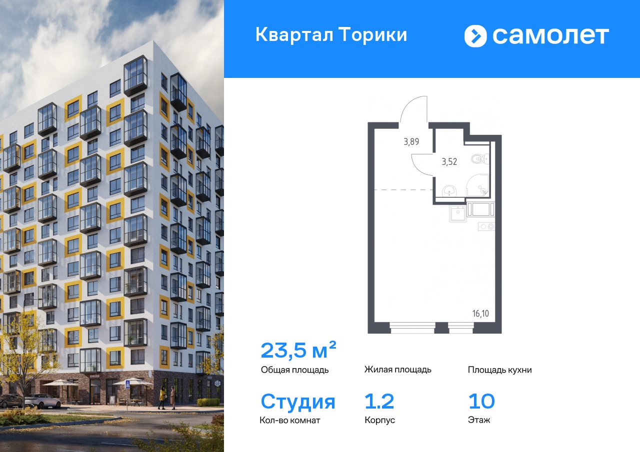 Строим кварталы для жизни с заботой о будущем. Предлагается квартира студия комфорт-класса 23,51 кв.м в корпусе 1.2 на 10 этаже, в ЖК «Квартал Торики» Квартира без отделки. Доступность опции «отделка» и возможность комплектации мебелью и декором уточняйте у застройщика. Приобрести квартиру возможно по специальным акциям от застройщика, с текущими условиями акций можно ознакомиться в блоке «Акций». Цена динамическая и может отличаться, уточняйте актуальность у застройщика. Жилой комплекс «Квартал Торики» — комфортное место для семьи. Из окон открывается голубое небо, а все необходимое находится рядом. До центра Санкт-Петербурга — 40 минут на авто, до метро «Проспект Ветеранов» — 20 минут, рядом три автобусные остановки. Всего 15–20 минут пешком до Гореловского озера для прогулок и пикников. Полежаевский и Южно-Приморский парки подходят для выгула собак, а набережная канала реки Дудергофки — для велосипедных прогулок. В квартале — школа и 2 детских сада. Утро можно начать в кофейне на первом этаже, а вечером — закупить продуктов. Современные монолитные дома высотой 12 этажей выполнены в нейтральной цветовой гамме с яркими акцентами. Дворы с уютными «лесными гостиными» закрыты для посторонних — дети на игровых площадках будут в безопасности. На территории есть многоуровневые и плоскостные паркинги. Входы в подъезды без ступенек, предусмотрены кладовые и помещения для колясок и велосипедов. #yan19-2r1824964#О застройщике