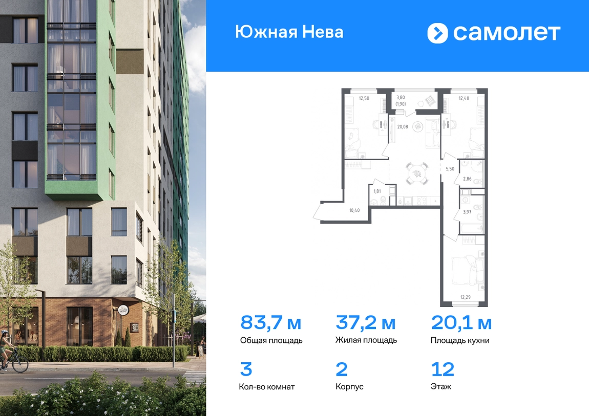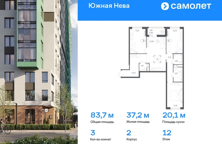 Строим кварталы для жизни с заботой о будущем. Предлагается 3-комнатная квартира комфорт-класса 83,71 кв.м в корпусе 2 на 12 этаже, в ЖК «Южная Нева» Квартира с чистовой отделкой. Доступность дополнительных опций уточняйте у застройщика. Приобрести квартиру возможно по специальным акциям от застройщика, с текущими условиями акций можно ознакомиться в блоке «Акций». Цена динамическая и может отличаться, уточняйте актуальность у застройщика. Спокойное течение Невы, монументальные арки Володарского моста и простор лесопарка создают атмосферу жилого комплекса «Южная Нева». До КАДа — всего 5 минут, до центра города — 30 минут на машине, а станция метро «Пролетарская» в 10 минутах. Для любителей природы рядом Невский лесопарк и «МЕГА Парк», где можно бегать, кататься на велосипеде или посетить веревочный парк. Для детей предусмотрены школа и 2 детских сада, а на первых этажах домов откроются салоны красоты, магазины и кафе. В шаговой доступности — фитнес-центр и торговые центры «МЕГА Дыбенко» и «Лондон Молл». Комплекс состоит из 11 монолитных домов высотой от 12 до 23 этажей с разноцветными фасадами и панорамными балконами. Двор украшают 7 мостов-навесов, а центральная аллея — собственная Нева. Здесь можно позагорать на лежаках или поиграть в шахматы, позаниматься на спортивной площадке или отвести ребенка в игровую зону на встречу с друзьями. В «Южной Неве» есть планировки с проходными кухнями-гостиными и гардеробными.#yan19-2r1743638#О застройщике