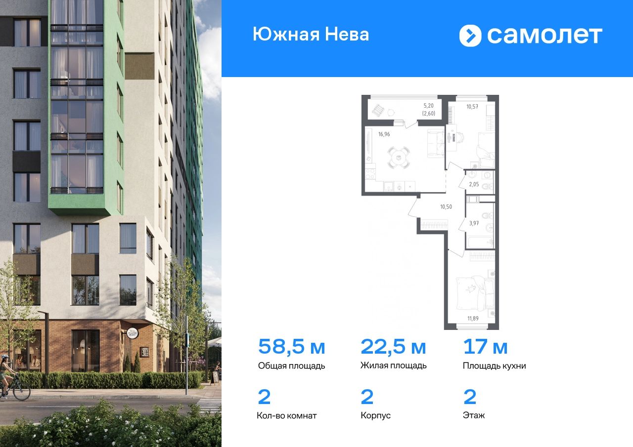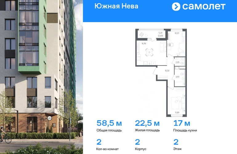 Строим кварталы для жизни с заботой о будущем. Предлагается 2-комнатная квартира комфорт-класса 58,54 кв.м в корпусе 2 на 2 этаже, в ЖК «Южная Нева» Квартира без отделки. Доступность опции «отделка» и возможность комплектации мебелью и декором уточняйте у застройщика. Приобрести квартиру возможно по специальным акциям от застройщика, с текущими условиями акций можно ознакомиться в блоке «Акций». Цена динамическая и может отличаться, уточняйте актуальность у застройщика. Спокойное течение Невы, монументальные арки Володарского моста и простор лесопарка создают атмосферу жилого комплекса «Южная Нева». До КАДа — всего 5 минут, до центра города — 30 минут на машине, а станция метро «Пролетарская» в 10 минутах. Для любителей природы рядом Невский лесопарк и «МЕГА Парк», где можно бегать, кататься на велосипеде или посетить веревочный парк. Для детей предусмотрены школа и 2 детских сада, а на первых этажах домов откроются салоны красоты, магазины и кафе. В шаговой доступности — фитнес-центр и торговые центры «МЕГА Дыбенко» и «Лондон Молл». Комплекс состоит из 11 монолитных домов высотой от 12 до 23 этажей с разноцветными фасадами и панорамными балконами. Двор украшают 7 мостов-навесов, а центральная аллея — собственная Нева. Здесь можно позагорать на лежаках или поиграть в шахматы, позаниматься на спортивной площадке или отвести ребенка в игровую зону на встречу с друзьями. В «Южной Неве» есть планировки с проходными кухнями-гостиными и гардеробными.#yan19-2r1762169#О застройщике