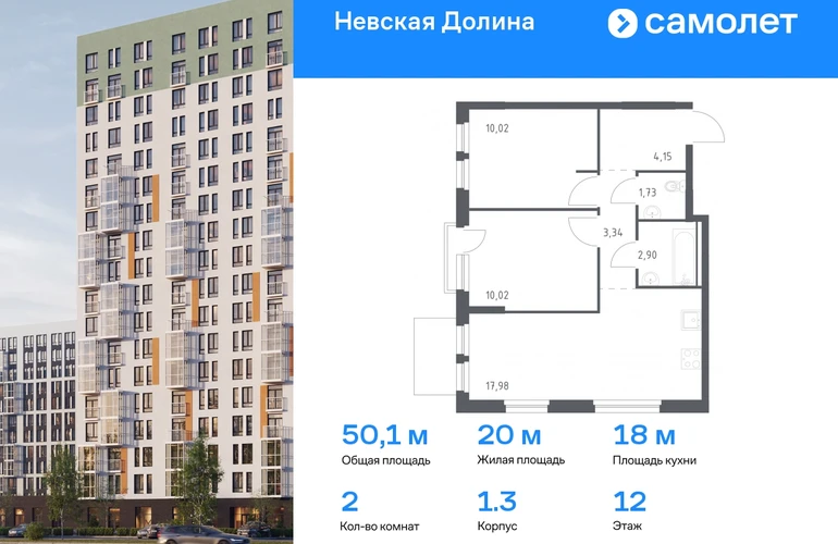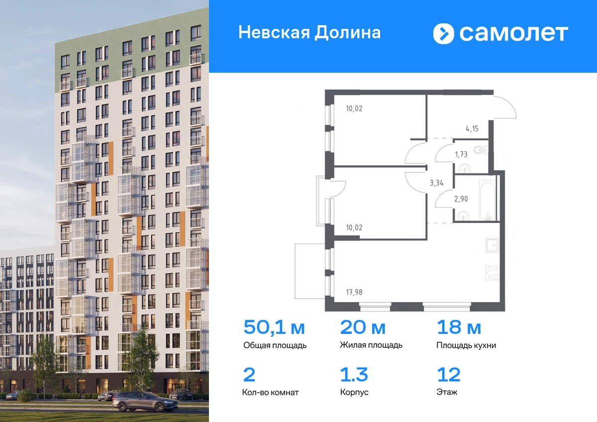 Строим кварталы для жизни с заботой о будущем. Предлагается 2-комнатная квартира комфорт-класса 50,14 кв.м в корпусе 1.3 на 12 этаже, в ЖК «Невская Долина» Квартира с предчистовой отделкой. Доступность дополнительных опций уточняйте у застройщика. Приобрести квартиру возможно по специальным акциям от застройщика, с текущими условиями акций можно ознакомиться в блоке «Акций». Цена динамическая и может отличаться, уточняйте актуальность у застройщика. «Невская Долина» — зеленый холст для вашей жизни с уникальными палисадниками, садами и уютными уголками для отдыха. Всего в 5 минутах на машине — КАД, рядом — Большой Обуховский мост. До центра Петербурга — 35 минут на авто, до метро «Пролетарская» — 15 минут, до аэропорта Пулково — 30 минут. Комплекс находится на правом берегу Невы, рядом с Невским лесопарком, «МЕГА Парком» и парком развлечений. Скоро во дворе комплекса построят 4 детских сада и 2 школы. Рядом уже есть магазины «Дикси», «Магнит», пункты выдачи и аптеки. На первых этажах будут кафе и минимаркеты, откроется медицинский центр и физкультурно-оздоровительный комплекс. Архитектура домов сочетает в себе современность и функциональность — фасады украшены большими окнами, лоджиями, обычными и французскими балконами. В «Невской Долине» есть сады плодовых культур, игровые и спортивные зоны, 11 многоуровневых паркингов.#yan19-2r1640233#О застройщике