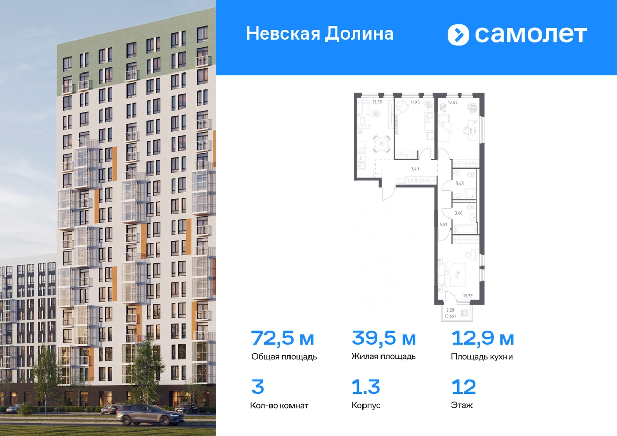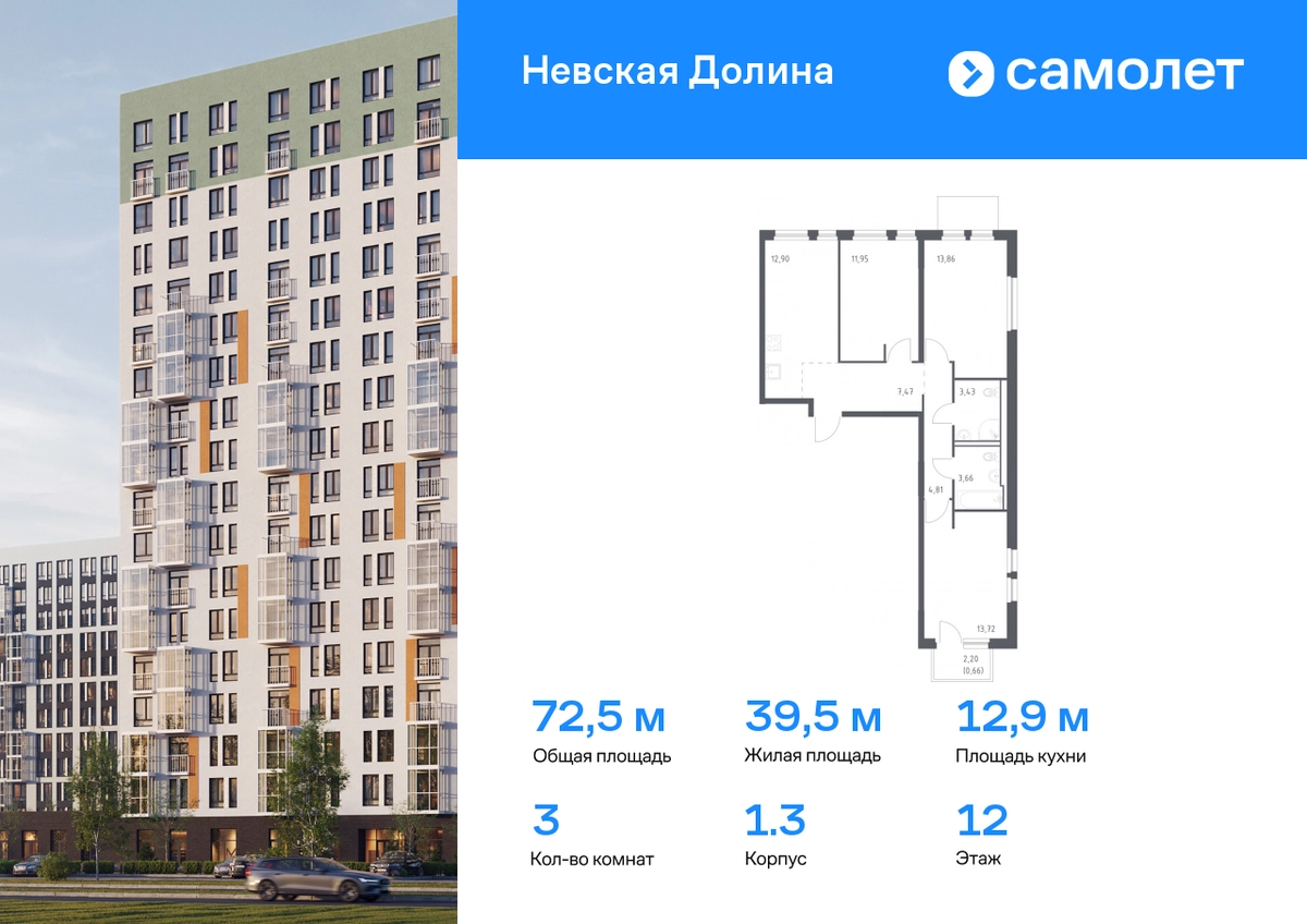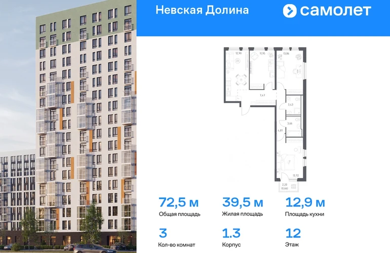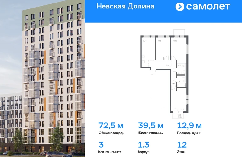 Строим кварталы для жизни с заботой о будущем. Предлагается 3-комнатная квартира комфорт-класса 72,46 кв.м в корпусе 1.3 на 12 этаже, в ЖК «Невская Долина» Квартира с чистовой отделкой. Доступность дополнительных опций уточняйте у застройщика. Приобрести квартиру возможно по специальным акциям от застройщика, с текущими условиями акций можно ознакомиться в блоке «Акций». Цена динамическая и может отличаться, уточняйте актуальность у застройщика. «Невская Долина» — зеленый холст для вашей жизни с уникальными палисадниками, садами и уютными уголками для отдыха. Всего в 5 минутах на машине — КАД, рядом — Большой Обуховский мост. До центра Петербурга — 35 минут на авто, до метро «Пролетарская» — 15 минут, до аэропорта Пулково — 30 минут. Комплекс находится на правом берегу Невы, рядом с Невским лесопарком, «МЕГА Парком» и парком развлечений. Скоро во дворе комплекса построят 4 детских сада и 2 школы. Рядом уже есть магазины «Дикси», «Магнит», пункты выдачи и аптеки. На первых этажах будут кафе и минимаркеты, откроется медицинский центр и физкультурно-оздоровительный комплекс. Архитектура домов сочетает в себе современность и функциональность — фасады украшены большими окнами, лоджиями, обычными и французскими балконами. В «Невской Долине» есть сады плодовых культур, игровые и спортивные зоны, 11 многоуровневых паркингов.#yan19-2r1732855#О застройщике