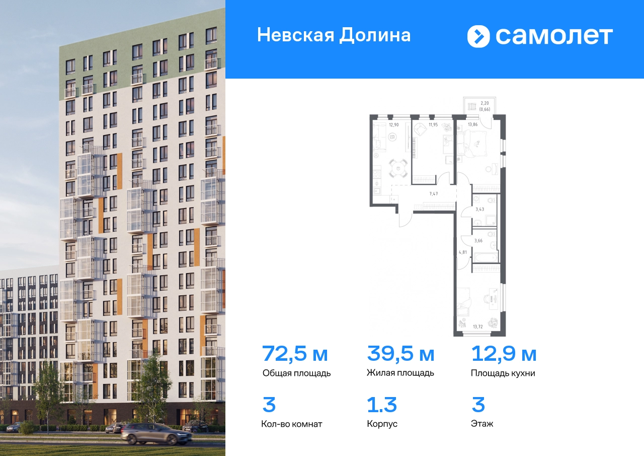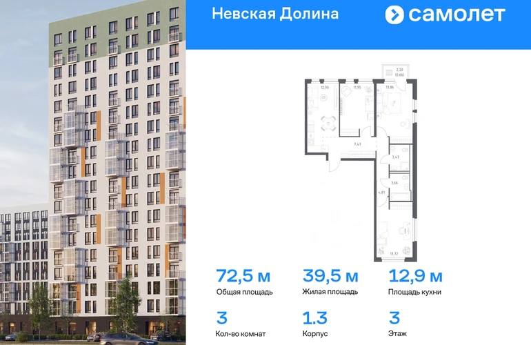 Строим кварталы для жизни с заботой о будущем. Предлагается 3-комнатная квартира комфорт-класса 72,46 кв.м в корпусе 1.3 на 3 этаже, в ЖК «Невская Долина» Квартира с чистовой отделкой. Доступность дополнительных опций уточняйте у застройщика. Приобрести квартиру возможно по специальным акциям от застройщика, с текущими условиями акций можно ознакомиться в блоке «Акций». Цена динамическая и может отличаться, уточняйте актуальность у застройщика. «Невская Долина» — зеленый холст для вашей жизни с уникальными палисадниками, садами и уютными уголками для отдыха. Всего в 5 минутах на машине — КАД, рядом — Большой Обуховский мост. До центра Петербурга — 35 минут на авто, до метро «Пролетарская» — 15 минут, до аэропорта Пулково — 30 минут. Комплекс находится на правом берегу Невы, рядом с Невским лесопарком, «МЕГА Парком» и парком развлечений. Скоро во дворе комплекса построят 4 детских сада и 2 школы. Рядом уже есть магазины «Дикси», «Магнит», пункты выдачи и аптеки. На первых этажах будут кафе и минимаркеты, откроется медицинский центр и физкультурно-оздоровительный комплекс. Архитектура домов сочетает в себе современность и функциональность — фасады украшены большими окнами, лоджиями, обычными и французскими балконами. В «Невской Долине» есть сады плодовых культур, игровые и спортивные зоны, 11 многоуровневых паркингов.#yan19-2r1810351#О застройщике