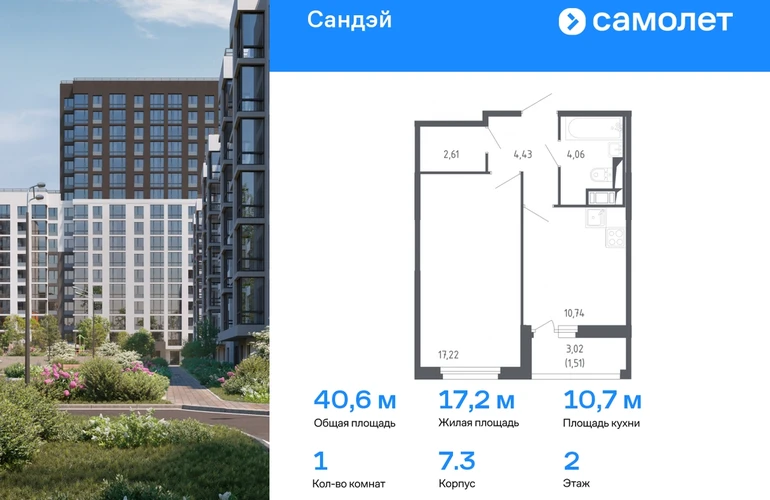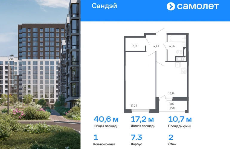 Строим кварталы для жизни с заботой о будущем. Предлагается 1-комнатная квартира комфорт-класса 40,57 кв.м в корпусе 7.3 на 2 этаже, в ЖК «Сандэй» Квартира с чистовой отделкой. Доступность дополнительных опций уточняйте у застройщика. Приобрести квартиру возможно по специальным акциям от застройщика, с текущими условиями акций можно ознакомиться в блоке «Акций». Цена динамическая и может отличаться, уточняйте актуальность у застройщика. Сандэй – современный жилой комплекс на юго-западе Санкт-Петербурга у парка Сосновая поляна. Мы уже построили 7 средне-этажных домов, вся социальная и бытовая инфраструктура уже работает, рядом есть детские сады, школы, поликлиники и магазины – проживание будет очень комфортным. Прямо под окнами большой зеленый парк для прогулок - Сосновая Поляна В 7 минутах пешком расположена железнодорожная станция, от которой можно за 25 минут добраться до центральной части города – Балтийского вокзала. В 15 минутах езды самые известные пригороды Петербурга: Стрельна, Петергоф, а также берег Финского залива.#yan19-2r1737567#О застройщике