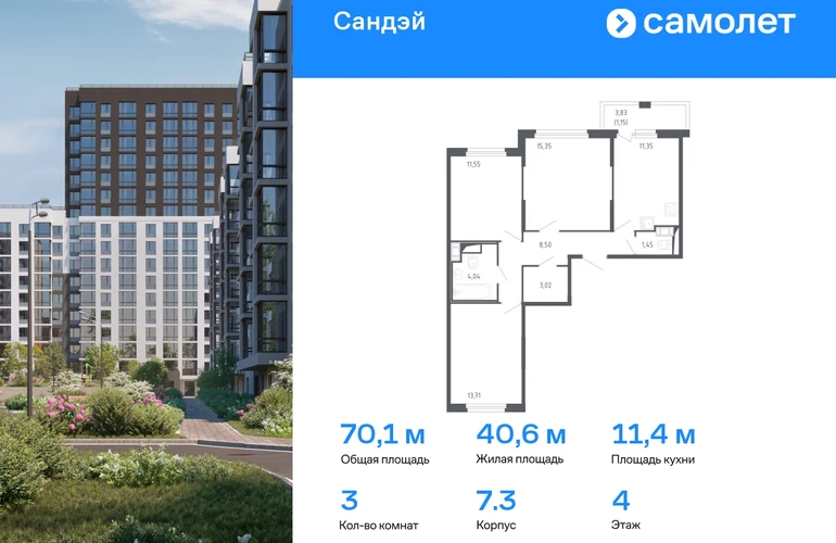 Строим кварталы для жизни с заботой о будущем. Предлагается 3-комнатная квартира комфорт-класса 70,12 кв.м в корпусе 7.3 на 4 этаже, в ЖК «Сандэй» Квартира с чистовой отделкой. Доступность дополнительных опций уточняйте у застройщика. Приобрести квартиру возможно по специальным акциям от застройщика, с текущими условиями акций можно ознакомиться в блоке «Акций». Цена динамическая и может отличаться, уточняйте актуальность у застройщика. Сандэй – современный жилой комплекс на юго-западе Санкт-Петербурга у парка Сосновая поляна. Мы уже построили 7 средне-этажных домов, вся социальная и бытовая инфраструктура уже работает, рядом есть детские сады, школы, поликлиники и магазины – проживание будет очень комфортным. Прямо под окнами большой зеленый парк для прогулок - Сосновая Поляна В 7 минутах пешком расположена железнодорожная станция, от которой можно за 25 минут добраться до центральной части города – Балтийского вокзала. В 15 минутах езды самые известные пригороды Петербурга: Стрельна, Петергоф, а также берег Финского залива.#yan19-2r1810699#О застройщике