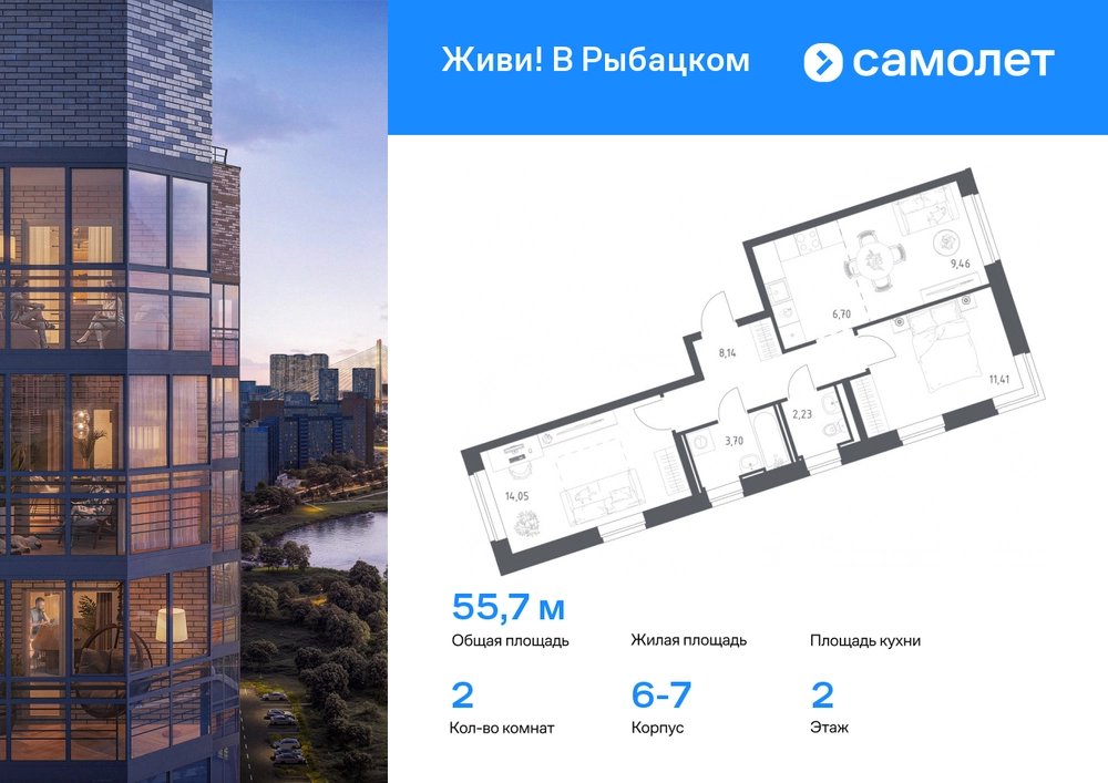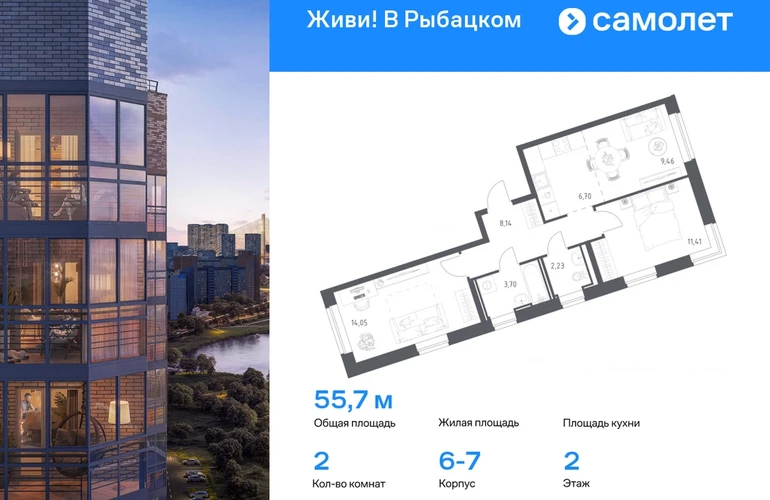 Строим кварталы для жизни с заботой о будущем. Предлагается 2-комнатная квартира комфорт-класса 55,69 кв.м в корпусе 6,7 на 2 этаже, в ЖК «Живи! В Рыбацком» Квартира без отделки. Доступность опции «отделка» и возможность комплектации мебелью и декором уточняйте у застройщика. Приобрести квартиру возможно по специальным акциям от застройщика, с текущими условиями акций можно ознакомиться в блоке «Акций». Цена динамическая и может отличаться, уточняйте актуальность у застройщика. Квартал «Живи! В Рыбацком» в Невском районе Санкт-Петербурга расположен рядом с рекой Славянкой и парком. Всего 20 минут пешей прогулки — и вы у метро «Рыбацкое». Автомобилисты будут добираться до КАДа за десять минут. В квартале работают два детских сада, школа и кабинет врача. На первых этажах зданий открыты магазины, кафе и салоны красоты. Во дворе — зеленые бульвары, воркаут-площадка, спортивный и игровой кластеры. Для машин — подземный паркинг. Кирпично-монолитные дома с каменной облицовкой — воплощение долговечности и тепла. Есть в квартале и камерный 30-й корпус, в нем восемь этажей, 70 квартир и приватный двор-парк. В сквозных парадных — безбарьерная среда, помещения для хранения колясок и велосипедов и система видеонаблюдения. #yan19-2r1798262#О застройщике