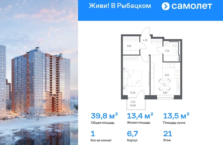 Строим кварталы для жизни с заботой о будущем. Предлагается 1-комнатная квартира комфорт-класса 39,83 кв.м в корпусе 6,7 на 21 этаже, в ЖК «Живи! В Рыбацком» Квартира без отделки. Доступность опции «отделка» и возможность комплектации мебелью и декором уточняйте у застройщика. Приобрести квартиру возможно по специальным акциям от застройщика, с текущими условиями акций можно ознакомиться в блоке «Акций». Цена динамическая и может отличаться, уточняйте актуальность у застройщика. Квартал «Живи! В Рыбацком» в Невском районе Санкт-Петербурга расположен рядом с рекой Славянкой и парком. Всего 20 минут пешей прогулки — и вы у метро «Рыбацкое». Автомобилисты будут добираться до КАДа за десять минут. В квартале работают два детских сада, школа и кабинет врача. На первых этажах зданий открыты магазины, кафе и салоны красоты. Во дворе — зеленые бульвары, воркаут-площадка, спортивный и игровой кластеры. Для машин — подземный паркинг. Кирпично-монолитные дома с каменной облицовкой — воплощение долговечности и тепла. Есть в квартале и камерный 30-й корпус, в нем восемь этажей, 70 квартир и приватный двор-парк. В сквозных парадных — безбарьерная среда, помещения для хранения колясок и велосипедов и система видеонаблюдения. #yan19-2r1829284#О застройщике