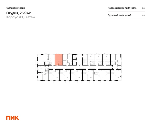 Продаётся квартира-студия площадью 25.90 кв.м на 3 этаже 12 этажного дома (Корпус 4.1, секция 4) проекта ПИК Таллинский парк. Светлый просторный подъезд на уровне земли, функциональная планировка, большие окна, с отделкой. <br> <br>«Таллинский парк» — проект в Ленинградской области, в районе Новоселье. До станции метро «Проспект Ветеранов» — 15 минут на автомобиле, а до КАД можно доехать всего за 4 минуты. <br> <br>«Таллинский парк» включает 16 жилых домов, детский сад и школу. В проекте появится центральный сквер с обильным озеленением, а через весь квартал протянутся широкие пешеходные бульвары. В зелёных дворах-парках будут оборудованы современные детские и спортивные площадки, обустроены места для отдыха. На первых этажах разместятся магазины, кафе и другие сервисы. <br> <br>Район Новоселье активно развивается в городском формате: здесь уже работают детские сады, школа и магазины. Для любителей зимних видов спорта открыта круглосуточная ледовая арена Ice Rink. За покупками и развлечениями также можно быстро доехать: 10 минут — и вы в Аутлете Fashion House Таллинское, гипермаркетах Лента, Лемана про и Окей. <br> <br>В 10 минутах на автомобиле находится Финский залив, на берегу которого расположились объекты культурного наследия. Рядом — Константиновский парк с отреставрированным дворцом, а чуть дальше расположена усадьба Знаменка. В великолепном Петергофе вы будете уже через 20 минут. Артикул - 1026688О застройщике