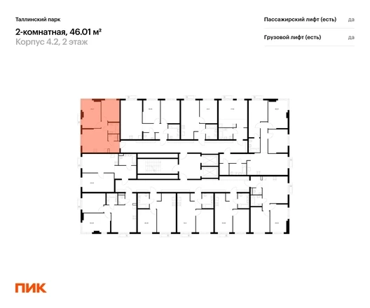 Продаётся 2-комн.квартира площадью 46.01 кв.м на 2 этаже 12 этажного дома (Корпус 4.2, секция 1) проекта ПИК Таллинский парк. Светлый просторный подъезд на уровне земли, функциональная планировка, большие окна. <br> <br>«Таллинский парк» — проект в Ленинградской области, в районе Новоселье. До станции метро «Проспект Ветеранов» — 15 минут на автомобиле, а до КАД можно доехать всего за 4 минуты. <br> <br>«Таллинский парк» включает 16 жилых домов, детский сад и школу. В проекте появится центральный сквер с обильным озеленением, а через весь квартал протянутся широкие пешеходные бульвары. В зелёных дворах-парках будут оборудованы современные детские и спортивные площадки, обустроены места для отдыха. На первых этажах разместятся магазины, кафе и другие сервисы. <br> <br>Район Новоселье активно развивается в городском формате: здесь уже работают детские сады, школа и магазины. Для любителей зимних видов спорта открыта круглосуточная ледовая арена Ice Rink. За покупками и развлечениями также можно быстро доехать: 10 минут — и вы в Аутлете Fashion House Таллинское, гипермаркетах Лента, Лемана про и Окей. <br> <br>В 10 минутах на автомобиле находится Финский залив, на берегу которого расположились объекты культурного наследия. Рядом — Константиновский парк с отреставрированным дворцом, а чуть дальше расположена усадьба Знаменка. В великолепном Петергофе вы будете уже через 20 минут. Артикул - 1026195О застройщике