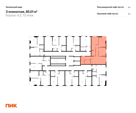 Продаётся 3-комн.квартира площадью 85.01 кв.м на 12 этаже 12 этажного дома (Корпус 4.2, секция 1) проекта ПИК Таллинский парк. Светлый просторный подъезд на уровне земли, функциональная планировка, большие окна. <br> <br>«Таллинский парк» — проект в Ленинградской области, в районе Новоселье. До станции метро «Проспект Ветеранов» — 15 минут на автомобиле, а до КАД можно доехать всего за 4 минуты. <br> <br>«Таллинский парк» включает 16 жилых домов, детский сад и школу. В проекте появится центральный сквер с обильным озеленением, а через весь квартал протянутся широкие пешеходные бульвары. В зелёных дворах-парках будут оборудованы современные детские и спортивные площадки, обустроены места для отдыха. На первых этажах разместятся магазины, кафе и другие сервисы. <br> <br>Район Новоселье активно развивается в городском формате: здесь уже работают детские сады, школа и магазины. Для любителей зимних видов спорта открыта круглосуточная ледовая арена Ice Rink. За покупками и развлечениями также можно быстро доехать: 10 минут — и вы в Аутлете Fashion House Таллинское, гипермаркетах Лента, Лемана про и Окей. <br> <br>В 10 минутах на автомобиле находится Финский залив, на берегу которого расположились объекты культурного наследия. Рядом — Константиновский парк с отреставрированным дворцом, а чуть дальше расположена усадьба Знаменка. В великолепном Петергофе вы будете уже через 20 минут. Артикул - 1026533О застройщике