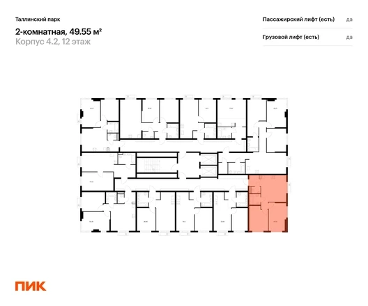 Продаётся 2-комн.квартира площадью 49.55 кв.м на 12 этаже 12 этажного дома (Корпус 4.2, секция 1) проекта ПИК Таллинский парк. Светлый просторный подъезд на уровне земли, функциональная планировка, большие окна. <br> <br>«Таллинский парк» — проект в Ленинградской области, в районе Новоселье. До станции метро «Проспект Ветеранов» — 15 минут на автомобиле, а до КАД можно доехать всего за 4 минуты. <br> <br>«Таллинский парк» включает 16 жилых домов, детский сад и школу. В проекте появится центральный сквер с обильным озеленением, а через весь квартал протянутся широкие пешеходные бульвары. В зелёных дворах-парках будут оборудованы современные детские и спортивные площадки, обустроены места для отдыха. На первых этажах разместятся магазины, кафе и другие сервисы. <br> <br>Район Новоселье активно развивается в городском формате: здесь уже работают детские сады, школа и магазины. Для любителей зимних видов спорта открыта круглосуточная ледовая арена Ice Rink. За покупками и развлечениями также можно быстро доехать: 10 минут — и вы в Аутлете Fashion House Таллинское, гипермаркетах Лента, Лемана про и Окей. <br> <br>В 10 минутах на автомобиле находится Финский залив, на берегу которого расположились объекты культурного наследия. Рядом — Константиновский парк с отреставрированным дворцом, а чуть дальше расположена усадьба Знаменка. В великолепном Петергофе вы будете уже через 20 минут. Артикул - 1026536О застройщике