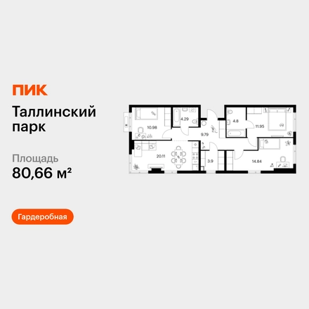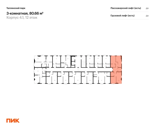 Продаётся 3-комн.квартира площадью 80.66 кв.м на 12 этаже 12 этажного дома (Корпус 4.1, секция 4) проекта ПИК Таллинский парк. Светлый просторный подъезд на уровне земли, функциональная планировка, большие окна, с отделкой. <br> <br>«Таллинский парк» — проект в Ленинградской области, в районе Новоселье. До станции метро «Проспект Ветеранов» — 15 минут на автомобиле, а до КАД можно доехать всего за 4 минуты. <br> <br>«Таллинский парк» включает 16 жилых домов, детский сад и школу. В проекте появится центральный сквер с обильным озеленением, а через весь квартал протянутся широкие пешеходные бульвары. В зелёных дворах-парках будут оборудованы современные детские и спортивные площадки, обустроены места для отдыха. На первых этажах разместятся магазины, кафе и другие сервисы. <br> <br>Район Новоселье активно развивается в городском формате: здесь уже работают детские сады, школа и магазины. Для любителей зимних видов спорта открыта круглосуточная ледовая арена Ice Rink. За покупками и развлечениями также можно быстро доехать: 10 минут — и вы в Аутлете Fashion House Таллинское, гипермаркетах Лента, Лемана про и Окей. <br> <br>В 10 минутах на автомобиле находится Финский залив, на берегу которого расположились объекты культурного наследия. Рядом — Константиновский парк с отреставрированным дворцом, а чуть дальше расположена усадьба Знаменка. В великолепном Петергофе вы будете уже через 20 минут. Артикул - 1026797О застройщике