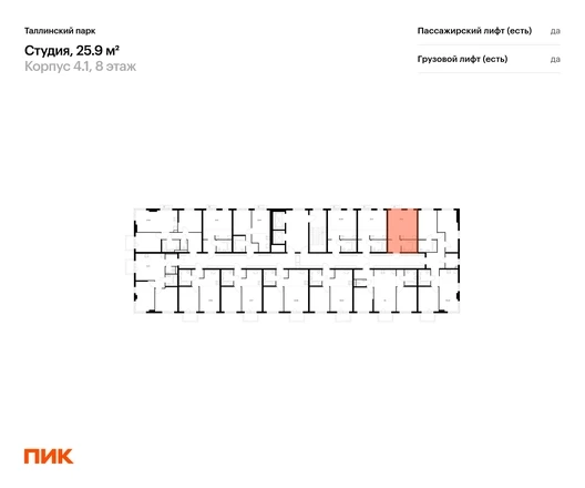Продаётся квартира-студия площадью 25.90 кв.м на 8 этаже 12 этажного дома (Корпус 4.1, секция 4) проекта ПИК Таллинский парк. Светлый просторный подъезд на уровне земли, функциональная планировка, большие окна, с отделкой. <br> <br>«Таллинский парк» — проект в Ленинградской области, в районе Новоселье. До станции метро «Проспект Ветеранов» — 15 минут на автомобиле, а до КАД можно доехать всего за 4 минуты. <br> <br>«Таллинский парк» включает 16 жилых домов, детский сад и школу. В проекте появится центральный сквер с обильным озеленением, а через весь квартал протянутся широкие пешеходные бульвары. В зелёных дворах-парках будут оборудованы современные детские и спортивные площадки, обустроены места для отдыха. На первых этажах разместятся магазины, кафе и другие сервисы. <br> <br>Район Новоселье активно развивается в городском формате: здесь уже работают детские сады, школа и магазины. Для любителей зимних видов спорта открыта круглосуточная ледовая арена Ice Rink. За покупками и развлечениями также можно быстро доехать: 10 минут — и вы в Аутлете Fashion House Таллинское, гипермаркетах Лента, Лемана про и Окей. <br> <br>В 10 минутах на автомобиле находится Финский залив, на берегу которого расположились объекты культурного наследия. Рядом — Константиновский парк с отреставрированным дворцом, а чуть дальше расположена усадьба Знаменка. В великолепном Петергофе вы будете уже через 20 минут. Артикул - 1026744О застройщике