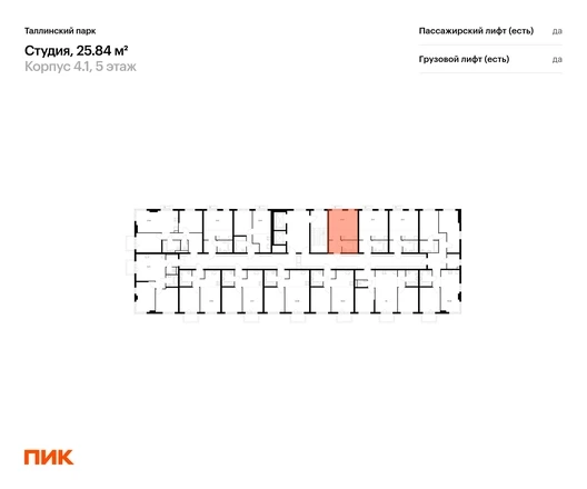 Продаётся квартира-студия площадью 25.84 кв.м на 5 этаже 12 этажного дома (Корпус 4.1, секция 4) проекта ПИК Таллинский парк. Светлый просторный подъезд на уровне земли, функциональная планировка, большие окна, с отделкой. <br> <br>«Таллинский парк» — проект в Ленинградской области, в районе Новоселье. До станции метро «Проспект Ветеранов» — 15 минут на автомобиле, а до КАД можно доехать всего за 4 минуты. <br> <br>«Таллинский парк» включает 16 жилых домов, детский сад и школу. В проекте появится центральный сквер с обильным озеленением, а через весь квартал протянутся широкие пешеходные бульвары. В зелёных дворах-парках будут оборудованы современные детские и спортивные площадки, обустроены места для отдыха. На первых этажах разместятся магазины, кафе и другие сервисы. <br> <br>Район Новоселье активно развивается в городском формате: здесь уже работают детские сады, школа и магазины. Для любителей зимних видов спорта открыта круглосуточная ледовая арена Ice Rink. За покупками и развлечениями также можно быстро доехать: 10 минут — и вы в Аутлете Fashion House Таллинское, гипермаркетах Лента, Лемана про и Окей. <br> <br>В 10 минутах на автомобиле находится Финский залив, на берегу которого расположились объекты культурного наследия. Рядом — Константиновский парк с отреставрированным дворцом, а чуть дальше расположена усадьба Знаменка. В великолепном Петергофе вы будете уже через 20 минут. Артикул - 1026702О застройщике