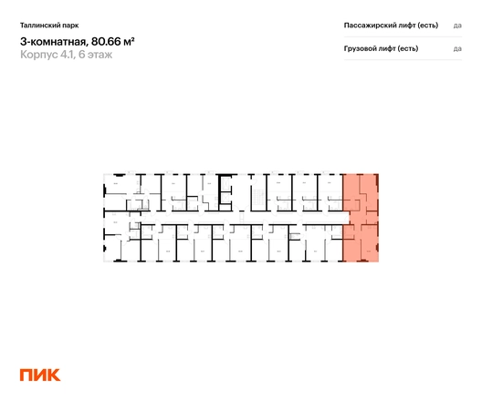 Продаётся 3-комн.квартира площадью 80.66 кв.м на 6 этаже 12 этажного дома (Корпус 4.1, секция 4) проекта ПИК Таллинский парк. Светлый просторный подъезд на уровне земли, функциональная планировка, большие окна, с отделкой. <br> <br>«Таллинский парк» — проект в Ленинградской области, в районе Новоселье. До станции метро «Проспект Ветеранов» — 15 минут на автомобиле, а до КАД можно доехать всего за 4 минуты. <br> <br>«Таллинский парк» включает 16 жилых домов, детский сад и школу. В проекте появится центральный сквер с обильным озеленением, а через весь квартал протянутся широкие пешеходные бульвары. В зелёных дворах-парках будут оборудованы современные детские и спортивные площадки, обустроены места для отдыха. На первых этажах разместятся магазины, кафе и другие сервисы. <br> <br>Район Новоселье активно развивается в городском формате: здесь уже работают детские сады, школа и магазины. Для любителей зимних видов спорта открыта круглосуточная ледовая арена Ice Rink. За покупками и развлечениями также можно быстро доехать: 10 минут — и вы в Аутлете Fashion House Таллинское, гипермаркетах Лента, Лемана про и Окей. <br> <br>В 10 минутах на автомобиле находится Финский залив, на берегу которого расположились объекты культурного наследия. Рядом — Константиновский парк с отреставрированным дворцом, а чуть дальше расположена усадьба Знаменка. В великолепном Петергофе вы будете уже через 20 минут. Артикул - 1026719О застройщике