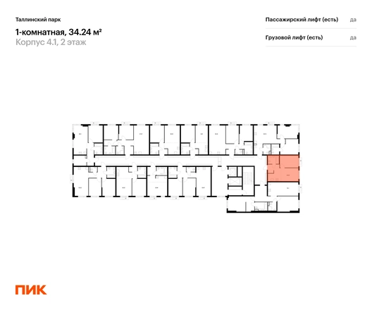Продаётся 1-комн.квартира площадью 34.24 кв.м на 2 этаже 12 этажного дома (Корпус 4.1, секция 1) проекта ПИК Таллинский парк. Светлый просторный подъезд на уровне земли, функциональная планировка, большие окна. <br> <br>«Таллинский парк» — проект в Ленинградской области, в районе Новоселье. До станции метро «Проспект Ветеранов» — 15 минут на автомобиле, а до КАД можно доехать всего за 4 минуты. <br> <br>«Таллинский парк» включает 16 жилых домов, детский сад и школу. В проекте появится центральный сквер с обильным озеленением, а через весь квартал протянутся широкие пешеходные бульвары. В зелёных дворах-парках будут оборудованы современные детские и спортивные площадки, обустроены места для отдыха. На первых этажах разместятся магазины, кафе и другие сервисы. <br> <br>Район Новоселье активно развивается в городском формате: здесь уже работают детские сады, школа и магазины. Для любителей зимних видов спорта открыта круглосуточная ледовая арена Ice Rink. За покупками и развлечениями также можно быстро доехать: 10 минут — и вы в Аутлете Fashion House Таллинское, гипермаркетах Лента, Лемана про и Окей. <br> <br>В 10 минутах на автомобиле находится Финский залив, на берегу которого расположились объекты культурного наследия. Рядом — Константиновский парк с отреставрированным дворцом, а чуть дальше расположена усадьба Знаменка. В великолепном Петергофе вы будете уже через 20 минут. Артикул - 1026100О застройщике