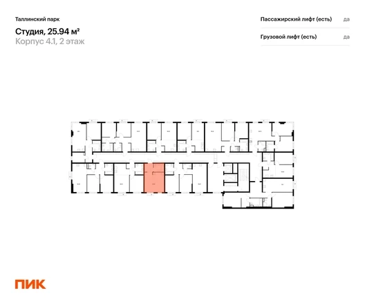 Продаётся квартира-студия площадью 25.94 кв.м на 2 этаже 12 этажного дома (Корпус 4.1, секция 1) проекта ПИК Таллинский парк. Светлый просторный подъезд на уровне земли, функциональная планировка, большие окна. <br> <br>«Таллинский парк» — проект в Ленинградской области, в районе Новоселье. До станции метро «Проспект Ветеранов» — 15 минут на автомобиле, а до КАД можно доехать всего за 4 минуты. <br> <br>«Таллинский парк» включает 16 жилых домов, детский сад и школу. В проекте появится центральный сквер с обильным озеленением, а через весь квартал протянутся широкие пешеходные бульвары. В зелёных дворах-парках будут оборудованы современные детские и спортивные площадки, обустроены места для отдыха. На первых этажах разместятся магазины, кафе и другие сервисы. <br> <br>Район Новоселье активно развивается в городском формате: здесь уже работают детские сады, школа и магазины. Для любителей зимних видов спорта открыта круглосуточная ледовая арена Ice Rink. За покупками и развлечениями также можно быстро доехать: 10 минут — и вы в Аутлете Fashion House Таллинское, гипермаркетах Лента, Лемана про и Окей. <br> <br>В 10 минутах на автомобиле находится Финский залив, на берегу которого расположились объекты культурного наследия. Рядом — Константиновский парк с отреставрированным дворцом, а чуть дальше расположена усадьба Знаменка. В великолепном Петергофе вы будете уже через 20 минут. Артикул - 1026091О застройщике