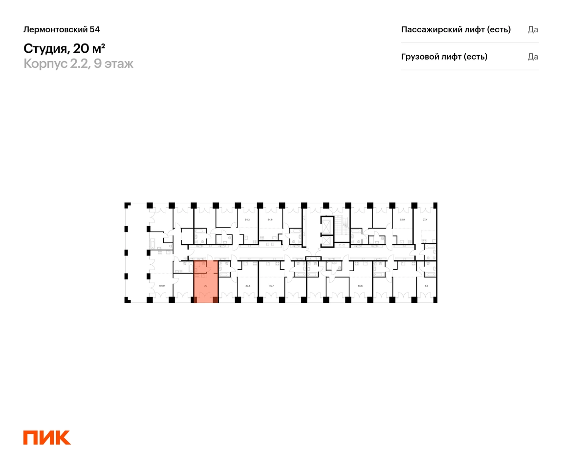 Продаётся квартира-студия площадью 20.00 кв.м на 9 этаже 9 этажного дома (Корпус 2.2, секция 13) проекта ПИК Лермонтовский 54. Светлый просторный подъезд на уровне земли, функциональная планировка, большие окна. <br> <br>«Лермонтовский 54» находится в центре Санкт-Петербурга на набережной Обводного канала, в 5 минутах пешком от метро «Балтийская». Здесь будут квартиры с окнами в пол, высокими потолками и террасами. <br> <br>Жилой квартал находится в центре Санкт-Петербурга, в Адмиралтейском районе, на набережной Обводного канала. В 5 минутах пешком — станция метро «Балтийская». До Невского проспекта на автомобиле ехать 8 минут, до Московского проспекта — всего 2 минуты. <br> <br>Необычные фасады «Лермонтовского 54» напоминают о промышленной архитектуре, которая была популярна в Санкт-Петербурге в конце XIX и начале XX века. Материал отделки — прочный кирпич, который прослужит до 100 лет. А благодаря системе чиллер-фанкойл на фасадах не будет блоков кондиционеров — всё охлаждение происходит внутри здания. <br> <br>В «Лермонтовском» возводятся дома высотой от 7 до 9 этажей с небольшим количеством квартир: на этаже может быть всего две квартиры. Во дворах будут закрытые парки с детскими площадками и местами для отдыха, а на подземном этаже — паркинг с удобной навигацией. Между домами протянется пешеходный бульвар для прогулок и отдыха, для велосипедистов предусмотрены специальные дорожки и парковки. <br> <br>В 2024 году в «Лермонтовском 54» открылся лицей на 1000 мест. Он разместился в здании 1824 года — раньше здесь было Николаевское кавалерийское училище. <br> <br>Во всех квартирах будут трёхметровые потолки и окна в пол. На 8-м и 9-м этажах будут лоджии, а на других этажах — французские и обычные балконы. Также здесь можно выбрать квартиру с террасой или патио. <br> <br>На первых этажах откроются магазины, кафе и другие сервисы. Со стороны набережной в домах, которые признаны объектами культурного наследия, мы разместим общественные пространства. <br> <br>Недалеко от «Лермонтовского 54» находится Юсуповский дворец, парк Екатерингоф, на машине можно доехать до острова Новая Голландия и Мариинского театра. Рядом работают школы, детские сады, торговые центры и гипермаркеты. Артикул - 921720О застройщике