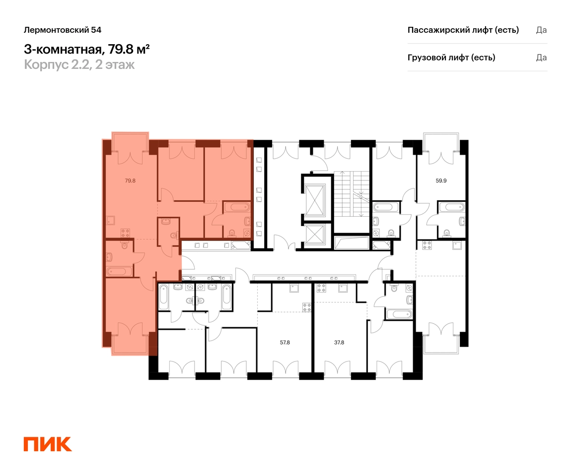Продаётся 3-комн.квартира площадью 79.80 кв.м на 6 этаже 9 этажного дома (Корпус 2.2, секция 11) проекта ПИК Лермонтовский 54. Светлый просторный подъезд на уровне земли, функциональная планировка, большие окна. <br> <br>«Лермонтовский 54» находится в центре Санкт-Петербурга на набережной Обводного канала, в 5 минутах пешком от метро «Балтийская». Здесь будут квартиры с окнами в пол, высокими потолками и террасами. <br> <br>Жилой квартал находится в центре Санкт-Петербурга, в Адмиралтейском районе, на набережной Обводного канала. В 5 минутах пешком — станция метро «Балтийская». До Невского проспекта на автомобиле ехать 8 минут, до Московского проспекта — всего 2 минуты. <br> <br>Необычные фасады «Лермонтовского 54» напоминают о промышленной архитектуре, которая была популярна в Санкт-Петербурге в конце XIX и начале XX века. Материал отделки — прочный кирпич, который прослужит до 100 лет. А благодаря системе чиллер-фанкойл на фасадах не будет блоков кондиционеров — всё охлаждение происходит внутри здания. <br> <br>В «Лермонтовском» возводятся дома высотой от 7 до 9 этажей с небольшим количеством квартир: на этаже может быть всего две квартиры. Во дворах будут закрытые парки с детскими площадками и местами для отдыха, а на подземном этаже — паркинг с удобной навигацией. Между домами протянется пешеходный бульвар для прогулок и отдыха, для велосипедистов предусмотрены специальные дорожки и парковки. <br> <br>В 2024 году в «Лермонтовском 54» открылся лицей на 1000 мест. Он разместился в здании 1824 года — раньше здесь было Николаевское кавалерийское училище. <br> <br>Во всех квартирах будут трёхметровые потолки и окна в пол. На 8-м и 9-м этажах будут лоджии, а на других этажах — французские и обычные балконы. Также здесь можно выбрать квартиру с террасой или патио. <br> <br>На первых этажах откроются магазины, кафе и другие сервисы. Со стороны набережной в домах, которые признаны объектами культурного наследия, мы разместим общественные пространства. <br> <br>Недалеко от «Лермонтовского 54» находится Юсуповский дворец, парк Екатерингоф, на машине можно доехать до острова Новая Голландия и Мариинского театра. Рядом работают школы, детские сады, торговые центры и гипермаркеты. Артикул - 921576О застройщике