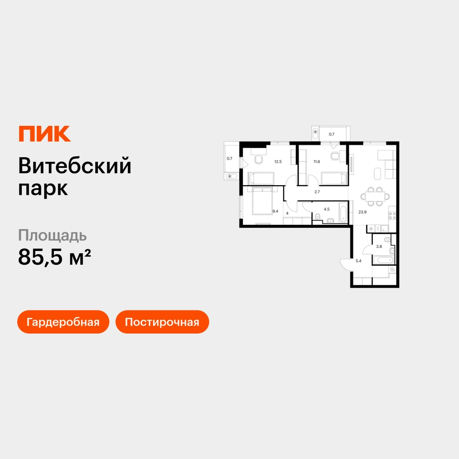 Продаётся 3-комн.квартира площадью 85.50 кв.м на 9 этаже 12 этажного дома (Корпус 6, секция 2) проекта ПИК Витебский парк. Светлый просторный подъезд на уровне земли, функциональная планировка, большие окна, с отделкой. <br> <br>Жилой квартал «Витебский парк» находится во Фрунзенском районе Санкт-Петербурга, в 15 минутах пешком от метро «Обводный канал». А в 2027 году всего в паре минут от проекта планируют открыть станцию метро «Боровая». <br> <br>В квартал входят 3 детских сада, школа и 7 жилых домов с дворами-парками, куда не могут зайти посторонние люди и заехать автомобили. Школа на 1250 мест и детский сад на 350 мест откроются одновременно с заселением первой очереди, это значит, что жители проекта смогут отдать своих детей в новые образовательные учреждения на территории квартала. <br> <br>Во дворах приятно отдыхать, знакомиться с соседями и даже заниматься йогой, а для детей мы построим детские площадки. Рядом появятся современные спортивные площадки. На первых этажах домов откроются магазины, кафе и другие сервисы. Через весь жилой район протянется широкий пешеходный бульвар для прогулок и спорта. <br> <br>Рядом с «Витебским парком» есть всё для комфортной жизни: магазины, торговые центры, фитнес-клубы, кафе и рестораны, а ещё детские сады, школы, вузы и поликлиника. Артикул - 1005300О застройщике