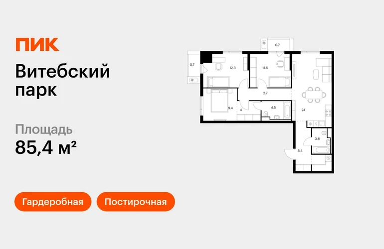 Продаётся 3-комн.квартира площадью 85.40 кв.м на 5 этаже 12 этажного дома (Корпус 6, секция 1) проекта ПИК Витебский парк. Светлый просторный подъезд на уровне земли, функциональная планировка, большие окна, с отделкой. <br> <br>Жилой квартал «Витебский парк» находится во Фрунзенском районе Санкт-Петербурга, в 15 минутах пешком от метро «Обводный канал». А в 2027 году всего в паре минут от проекта планируют открыть станцию метро «Боровая». <br> <br>В квартал входят 3 детских сада, школа и 7 жилых домов с дворами-парками, куда не могут зайти посторонние люди и заехать автомобили. Школа на 1250 мест и детский сад на 350 мест откроются одновременно с заселением первой очереди, это значит, что жители проекта смогут отдать своих детей в новые образовательные учреждения на территории квартала. <br> <br>Во дворах приятно отдыхать, знакомиться с соседями и даже заниматься йогой, а для детей мы построим детские площадки. Рядом появятся современные спортивные площадки. На первых этажах домов откроются магазины, кафе и другие сервисы. Через весь жилой район протянется широкий пешеходный бульвар для прогулок и спорта. <br> <br>Рядом с «Витебским парком» есть всё для комфортной жизни: магазины, торговые центры, фитнес-клубы, кафе и рестораны, а ещё детские сады, школы, вузы и поликлиника. Артикул - 1005119О застройщике