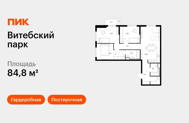 Продаётся 3-комн.квартира площадью 84.80 кв.м на 7 этаже 12 этажного дома (Корпус 6, секция 2) проекта ПИК Витебский парк. Светлый просторный подъезд на уровне земли, функциональная планировка, большие окна, с отделкой. <br> <br>Жилой квартал «Витебский парк» находится во Фрунзенском районе Санкт-Петербурга, в 15 минутах пешком от метро «Обводный канал». А в 2027 году всего в паре минут от проекта планируют открыть станцию метро «Боровая». <br> <br>В квартал входят 3 детских сада, школа и 7 жилых домов с дворами-парками, куда не могут зайти посторонние люди и заехать автомобили. Школа на 1250 мест и детский сад на 350 мест откроются одновременно с заселением первой очереди, это значит, что жители проекта смогут отдать своих детей в новые образовательные учреждения на территории квартала. <br> <br>Во дворах приятно отдыхать, знакомиться с соседями и даже заниматься йогой, а для детей мы построим детские площадки. Рядом появятся современные спортивные площадки. На первых этажах домов откроются магазины, кафе и другие сервисы. Через весь жилой район протянется широкий пешеходный бульвар для прогулок и спорта. <br> <br>Рядом с «Витебским парком» есть всё для комфортной жизни: магазины, торговые центры, фитнес-клубы, кафе и рестораны, а ещё детские сады, школы, вузы и поликлиника. Артикул - 1005276О застройщике