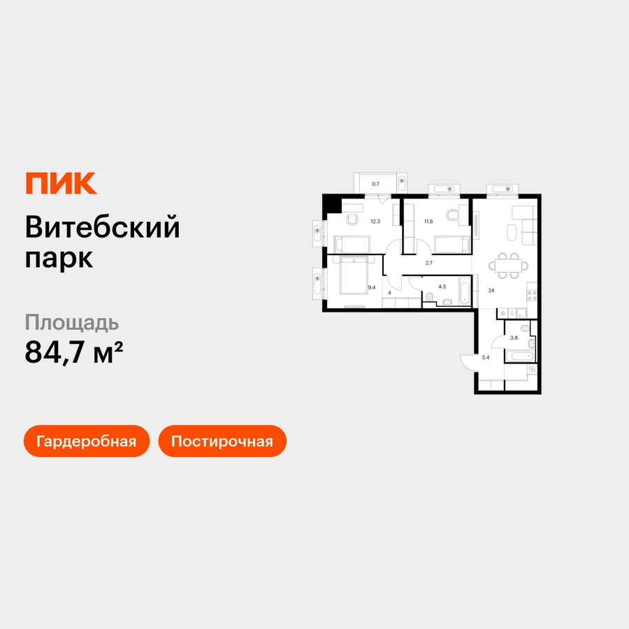 Продаётся 3-комн.квартира площадью 84.70 кв.м на 3 этаже 12 этажного дома (Корпус 6, секция 1) проекта ПИК Витебский парк. Светлый просторный подъезд на уровне земли, функциональная планировка, большие окна, с отделкой. <br> <br>Жилой квартал «Витебский парк» находится во Фрунзенском районе Санкт-Петербурга, в 15 минутах пешком от метро «Обводный канал». А в 2027 году всего в паре минут от проекта планируют открыть станцию метро «Боровая». <br> <br>В квартал входят 3 детских сада, школа и 7 жилых домов с дворами-парками, куда не могут зайти посторонние люди и заехать автомобили. Школа на 1250 мест и детский сад на 350 мест откроются одновременно с заселением первой очереди, это значит, что жители проекта смогут отдать своих детей в новые образовательные учреждения на территории квартала. <br> <br>Во дворах приятно отдыхать, знакомиться с соседями и даже заниматься йогой, а для детей мы построим детские площадки. Рядом появятся современные спортивные площадки. На первых этажах домов откроются магазины, кафе и другие сервисы. Через весь жилой район протянется широкий пешеходный бульвар для прогулок и спорта. <br> <br>Рядом с «Витебским парком» есть всё для комфортной жизни: магазины, торговые центры, фитнес-клубы, кафе и рестораны, а ещё детские сады, школы, вузы и поликлиника. Артикул - 1005095О застройщике