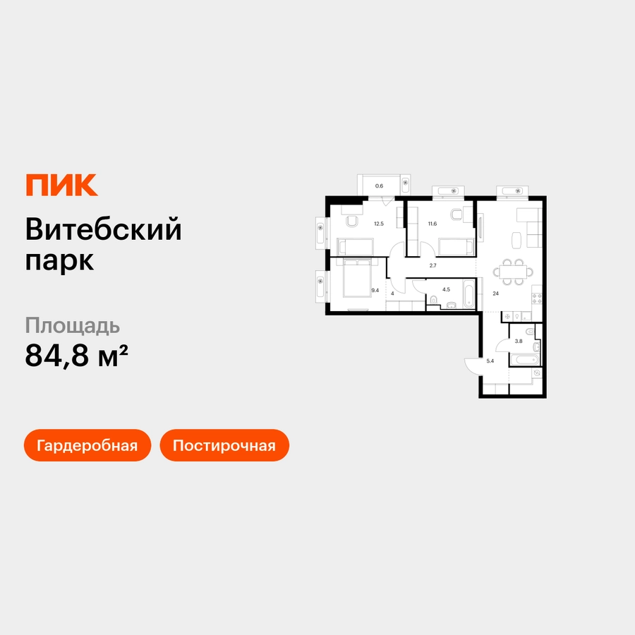 Продаётся 3-комн.квартира площадью 84.80 кв.м на 3 этаже 12 этажного дома (Корпус 6, секция 2) проекта ПИК Витебский парк. Светлый просторный подъезд на уровне земли, функциональная планировка, большие окна, с отделкой. <br> <br>Жилой квартал «Витебский парк» находится во Фрунзенском районе Санкт-Петербурга, в 15 минутах пешком от метро «Обводный канал». А в 2027 году всего в паре минут от проекта планируют открыть станцию метро «Боровая». <br> <br>В квартал входят 3 детских сада, школа и 7 жилых домов с дворами-парками, куда не могут зайти посторонние люди и заехать автомобили. Школа на 1250 мест и детский сад на 350 мест откроются одновременно с заселением первой очереди, это значит, что жители проекта смогут отдать своих детей в новые образовательные учреждения на территории квартала. <br> <br>Во дворах приятно отдыхать, знакомиться с соседями и даже заниматься йогой, а для детей мы построим детские площадки. Рядом появятся современные спортивные площадки. На первых этажах домов откроются магазины, кафе и другие сервисы. Через весь жилой район протянется широкий пешеходный бульвар для прогулок и спорта. <br> <br>Рядом с «Витебским парком» есть всё для комфортной жизни: магазины, торговые центры, фитнес-клубы, кафе и рестораны, а ещё детские сады, школы, вузы и поликлиника. Артикул - 1005228О застройщике