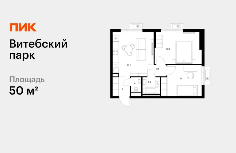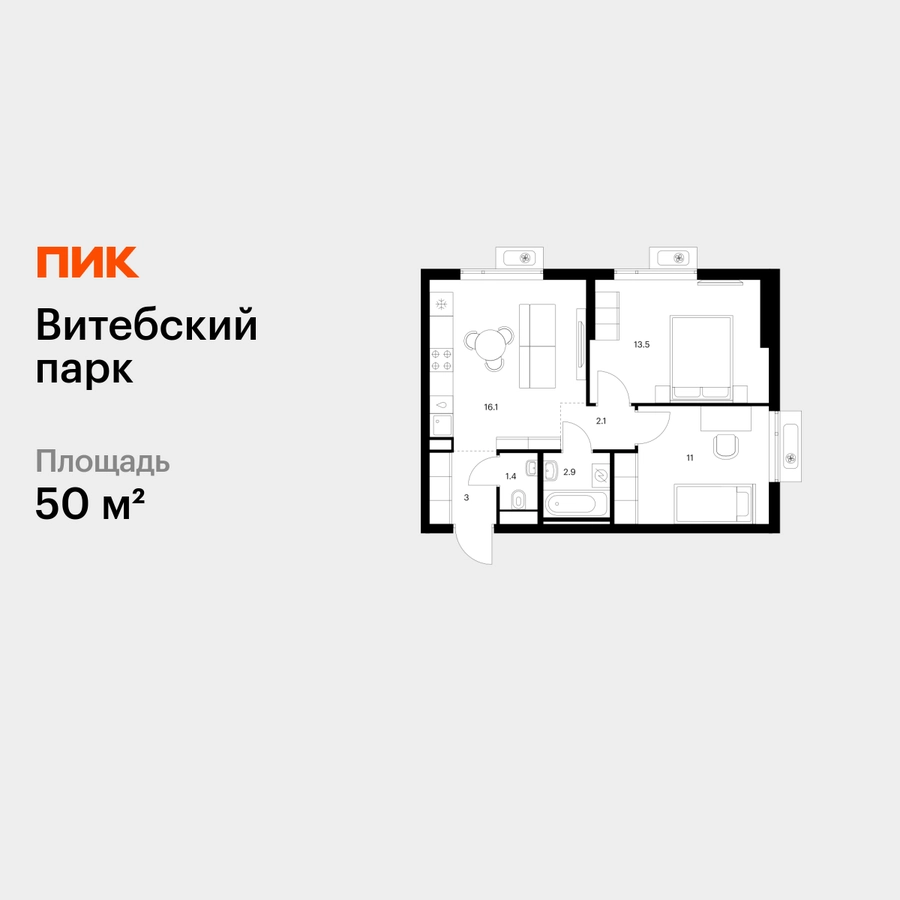 Продаётся 2-комн.квартира площадью 50.00 кв.м на 10 этаже 12 этажного дома (Корпус 6, секция 1) проекта ПИК Витебский парк. Светлый просторный подъезд на уровне земли, функциональная планировка, большие окна, с отделкой. <br> <br>Жилой квартал «Витебский парк» находится во Фрунзенском районе Санкт-Петербурга, в 15 минутах пешком от метро «Обводный канал». А в 2027 году всего в паре минут от проекта планируют открыть станцию метро «Боровая». <br> <br>В квартал входят 3 детских сада, школа и 7 жилых домов с дворами-парками, куда не могут зайти посторонние люди и заехать автомобили. Школа на 1250 мест и детский сад на 350 мест откроются одновременно с заселением первой очереди, это значит, что жители проекта смогут отдать своих детей в новые образовательные учреждения на территории квартала. <br> <br>Во дворах приятно отдыхать, знакомиться с соседями и даже заниматься йогой, а для детей мы построим детские площадки. Рядом появятся современные спортивные площадки. На первых этажах домов откроются магазины, кафе и другие сервисы. Через весь жилой район протянется широкий пешеходный бульвар для прогулок и спорта. <br> <br>Рядом с «Витебским парком» есть всё для комфортной жизни: магазины, торговые центры, фитнес-клубы, кафе и рестораны, а ещё детские сады, школы, вузы и поликлиника. Артикул - 1005186О застройщике